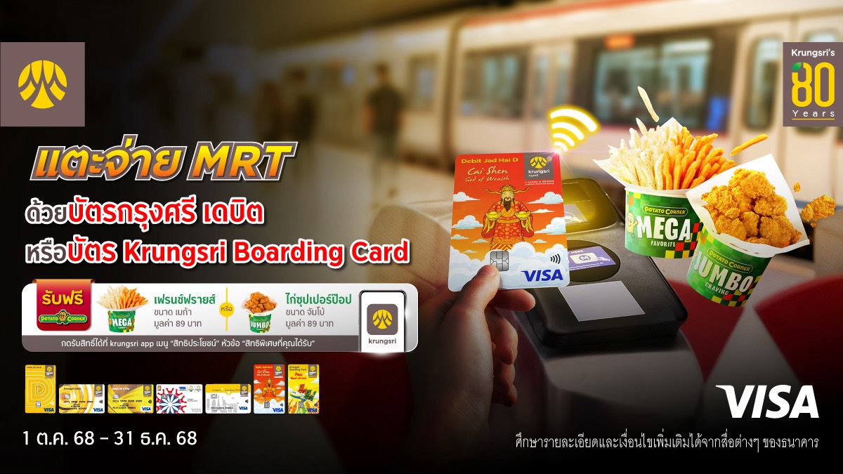 กรุงศรี (ธนาคารกรุงศรีอยุธยา จำกัด (มหาชน)) มอบสิทธิพิเศษสำหรับลูกค้าที่แตะจ่ายรถไฟฟ้า MRT ที่เข้าร่วมรายการ ได้แก่ สายสีแดง สายสีน้ำเงิน สายสีม่วง สายสีชมพู และ สายสีเหลือง ด้วยบัตรกรุงศรี เดบิต หรือบัตร Krungsri Boarding Card ที่มีสัญลักษณ์ Visa Contactless รับฟรี Potato Corner เฟรนช์ฟรายส์ ขนาดเมก้า (เลือกได้ 2 รสชาติ) หรือ ไก่ซุปเปอร์ป๊อป ขนาด จัมโบ้ มูลค่า 89 บาท (จำกัด 1 สิทธิ์/เดือน) กดรับสิทธิ์ได้ที่ krungsri app เมนู “สิทธิประโยชน์” หัวข้อ “สิทธิพิเศษที่คุณได้รับ” ตั้งแต่วันที่ 1 ตุลาคม 2568 – 31 ธันวาคม 2568