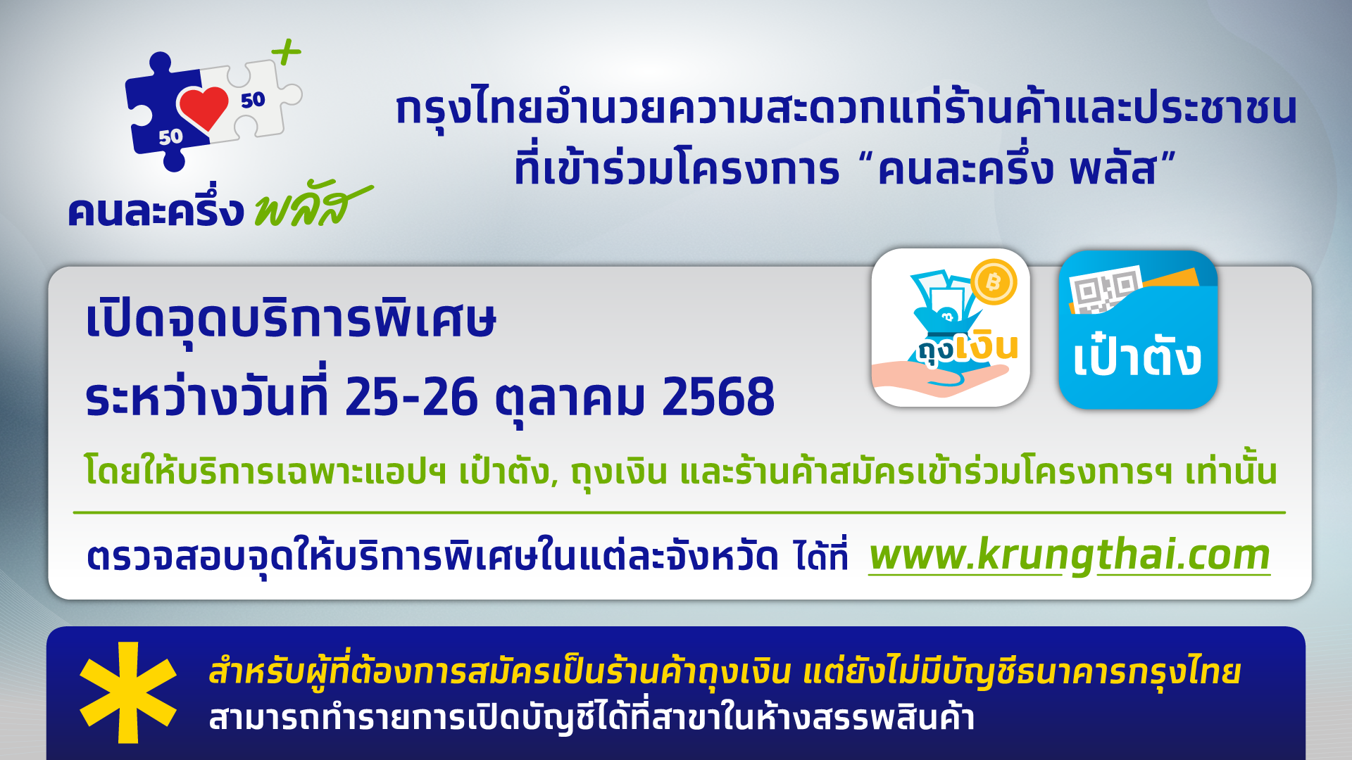 ธนาคารกรุงไทย อำนวยความสะดวกแก่ร้านค้าและประชาชนที่เข้าร่วมโครงการ “คนละครึ่ง พลัส” เปิดจุดบริการพิเศษ ระหว่างวันที่ 25 - 26 ตุลาคม 2568