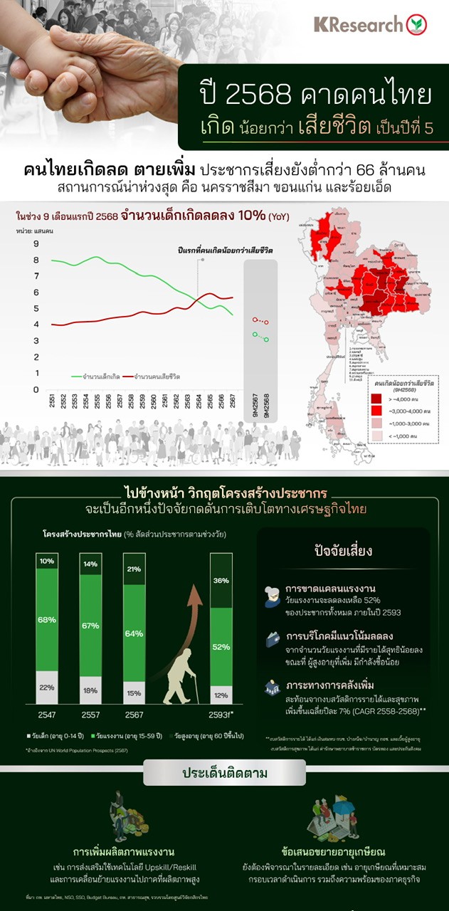 ประเทศไทยเผชิญการเปลี่ยนแปลงโครงสร้างประชากร ‘คนเกิดน้อยกว่าเสียชีวิต’ ต่อเนื่องมาตั้งแต่ปี 2564 ขณะที่ ข้อมูลในช่วง 9M2568 สะท้อนจำนวนเด็กเกิดใหม่อยู่ที่ 309,644 คน ลดลง 10% (YoY) ทำให้ทั้งปียังเสี่ยงจำนวนประชากรต่ำกว่า 66 ล้านคน โดยจังหวัดที่สถานการณ์คนเกิดน้อยกว่าเสียชีวิตมากที่สุด 3 จังหวัดแรก ได้แก่ นครราชสีมา ขอนแก่น และร้อยเอ็ด