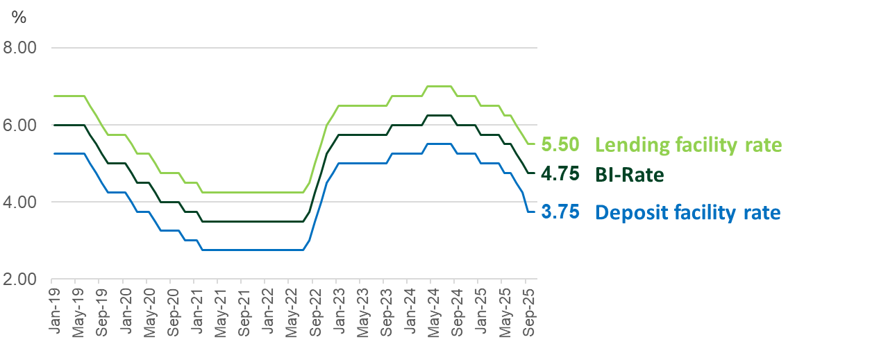 ศูนย์วิจัยกสิกรไทย มองว่า ในช่วงที่เหลือของปี BI จะชะลอการลดดอกเบี้ยเพื่อรอประเมินผลของมาตรการกระตุ้นเศรษฐกิจที่ผ่านมา และหันมาให้น้ำหนักกับการรักษาเสถียรภาพค่าเงิน ทั้งนี้ BI มีแนวโน้มลดดอกเบี้ยอีกสองครั้งถึงไตรมาส 1/2026