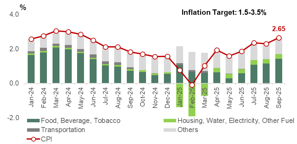 · เงินเฟ้อยังอยู่ในกรอบ ช่วยหนุนให้ BI คงแนวโน้มผ่อนคลายทางการเงินต่อไป โดยเงินเดือน ก.ย. ปรับตัวสูงขึ้นอยู่ที่ 2.65% สูงสุดในรอบ 16 เดือน (รูปที่ 3) ผลจากราคาอาหารและค่าใช้จ่ายด้านสุขภาพที่ปรับเพิ่มขึ้น แต่ยังอยู่ในกรอบเป้าหมายของ BI ที่ 1.5-3.5% อย่างไรก็ดี แนวโน้มค่าเงินรูเปียห์ที่อ่อนค่าอาจผลักดันเงินเฟ้อให้สูงขึ้นอีกในระยะต่อไป ทำให้การปรับลดดอกเบี้ยมีข้อจำกัดมากขึ้น