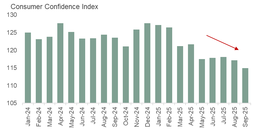 รูปที่ 4: ดัชนีความเชื่อมั่นผู้บริโภคในประเทศปรับตัวลดลงตั้งแต่ต้นปี 2025