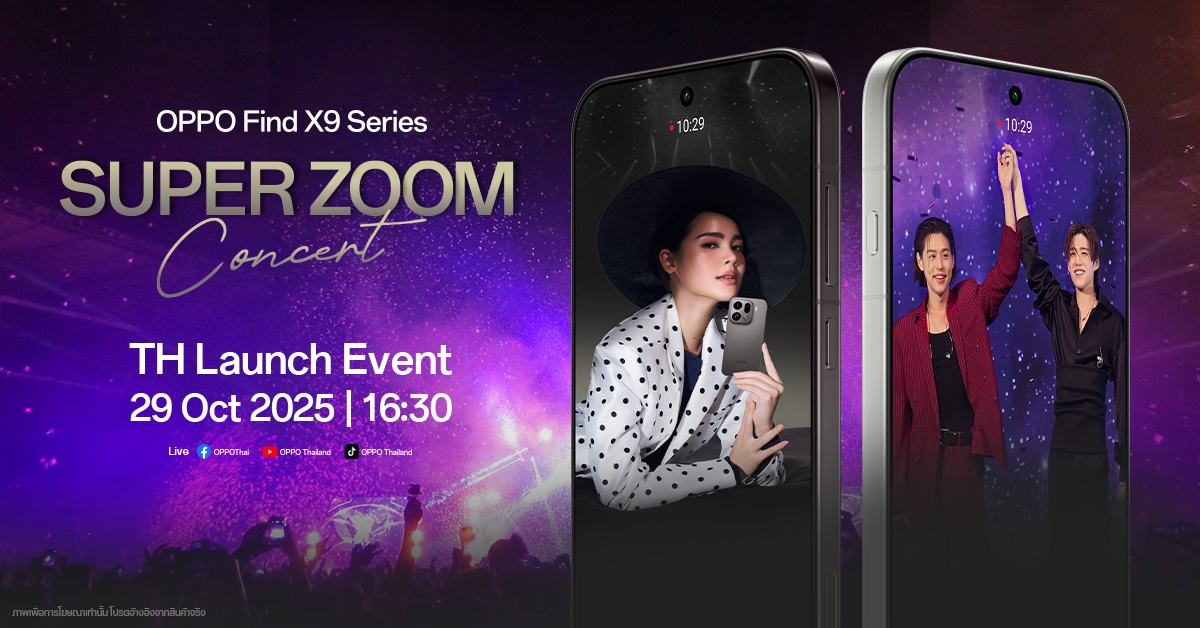 ออปโป้ ประเทศไทยเตรียมเปิดตัว OPPO Find X9 Series สมาร์ตโฟนแฟลกชิปซูมดีทุกคอนเสิร์ต พร้อมเตรียมพบกับประสบการณ์ความชัดระดับแฟลกชิปจาก OPPO กับงาน “Super Zoom Concert” คอนเสิร์ตครั้งใหญ่ที่รวมความบันเทิงและเทคโนโลยีเข้าไว้ด้วยกันอย่างลงตัว เพื่อเฉลิมฉลองการเปิดตัวสมาร์ตโฟนรุ่นใหม่ล่าสุด OPPO Find X9 Series สมาร์ตโฟนแฟลกชิปที่พร้อมยกระดับการซูมให้ชัดทุกองศา