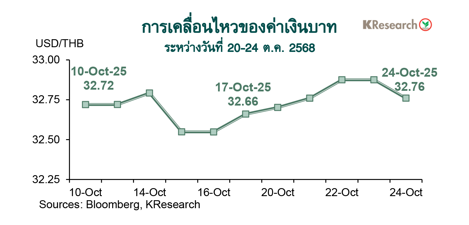 • สัปดาห์ระหว่างวันที่ 27-31 ต.ค. 2568 ธนาคารกสิกรไทยมองกรอบการเคลื่อนไหวของค่าเงินบาทที่ระดับ 32.40-33.00 บาทต่อดอลลาร์ฯ ขณะที่ศูนย์วิจัยกสิกรไทยประเมินปัจจัยสำคัญที่ต้องติดตาม ได้แก่ ตัวเลขการส่งออกและเครื่องชี้เศรษฐกิจเดือนก.ย. ของไทย ผลการประชุมเฟด (28-29 ต.ค.) สถานการณ์ราคาทองคำในตลาดโลก และทิศทางฟันด์โฟลว์ของต่างชาติ