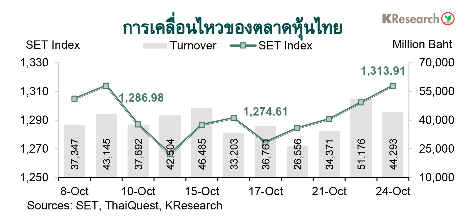 ตลาดหุ้นไทยยังมีแรงหนุนต่อเนื่อง โดยกลับมายืนเหนือแนว 1,300 จุดได้อีกครั้งช่วงกลางสัปดาห์ท่ามกลางแรงซื้อของกลุ่มนักลงทุนต่างชาติและบัญชีบริษัทหลักทรัพย์ นำโดย หุ้นกลุ่มแบงก์ที่รายงานผลประกอบการไตรมาส 3/2568 ออกมาดีกว่าคาด กลุ่มเทคโนโลยีจากการคาดการณ์เรื่องผลประกอบการไตรมาส 3/2568 รวมถึงหุ้นกลุ่มพลังงานจากอานิสงส์ของราคาน้ำมันในตลาดโลกปรับตัวขึ้น นอกจากนี้รายงานข่าวเกี่ยวกับการเปิดการเจรจาการค้ารอบใหม่ระหว่างสหรัฐฯ และจีน ช่วยหนุนให้ดัชนีหุ้นไทยขึ้นไปแตะจุดสูงสุดในรอบเกือบ 9 เดือนที่ระดับ 1,319.76 จุดในช่วงท้ายสัปดาห์ด้วยเช่นกัน