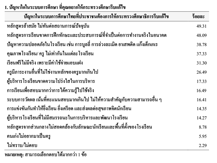 จากการสำรวจเมื่อถามถึงปัญหาในระบบการศึกษาไทยที่ประชาชนต้องการให้กระทรวงศึกษาธิการ รีบแก้ไข พบว่า ตัวอย่าง ร้อยละ 49.31 ระบุว่า หลักสูตรล้าสมัย ไม่ทันต่อสถานการณ์ปัจจุบัน รองลงมา ร้อยละ 48.09 ระบุว่า หลักสูตรการเรียนขาดการฝึกทักษะและประสบการณ์ที่จำเป็นต่อการทำงานจริงในอนาคต ร้อยละ 38.78 ระบุว่า ปัญหาความปลอดภัยในโรงเรียน เช่น การบูลลี่ การล่วงละเมิด ยาเสพติด แก๊งเด็กเกเร ร้อยละ 37.33 ระบุว่า คุณภาพโรงเรียน/ ครู ไม่เท่ากันในแต่ละโรงเรียน ร้อยละ 31.30 ระบุว่า เรียนฟรีไม่มีจริง เพราะมีค่าใช้จ่ายแอบแฝง ร้อยละ 26.49 ระบุว่า ครูมีภาระงานอื่นที่ไม่ใช่งานหลักของครูมากเกินไป ร้อยละ 17.33 ระบุว่า ผู้บริหารโรงเรียนขาดความโปร่งใสในการบริหาร ร้อยละ 16.49 ระบุว่า การเรียนเพื่อสอบมากกว่าการได้ความรู้ไปใช้จริงร้อยละ 16.41 ระบุว่า ระบบการวัดผล เน้นที่คะแนนสอบมากเกินไป ไม่ให้ความสำคัญกับความสามารถอื่น ๆ ร้อยละ 14.35 ระบุว่า การแข่งขันกันทำให้ยิ่งเรียน ยิ่งเครียด และส่งผลต่อสุขภาพจิตนักเรียน ร้อยละ 14.27 ระบุว่า ผู้บริหารโรงเรียนที่ไม่มีสมรรถนะในการบริหารและพัฒนาโรงเรียน ร้อยละ 8.78 ระบุว่า หลักสูตรจากส่วนกลางไม่สอดคล้องกับลักษณะนักเรียนและพื้นที่ตั้งของโรงเรียน ร้อยละ 5.95 ระบุว่า คนเก่งไม่อยากมาเป็นครู และร้อยละ 2.29 ระบุว่า ไม่ทราบ/ไม่ตอบ