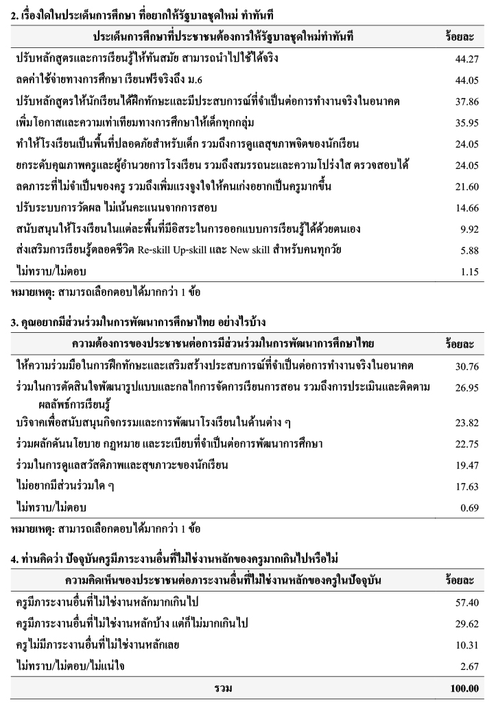 ด้านประเด็นการศึกษาที่ประชาชนต้องการให้รัฐบาลชุดใหม่ทำทันที พบว่า ตัวอย่าง ร้อยละ 44.27 ระบุว่า ปรับหลักสูตรและการเรียนรู้ให้ทันสมัย สามารถนำไปใช้ได้จริง รองลงมา ร้อยละ 44.05 ระบุว่า ลดค่าใช้จ่ายทางการศึกษา เรียนฟรีจริงถึง ม.6 ร้อยละ 37.86 ระบุว่า ปรับหลักสูตรให้นักเรียนได้ฝึกทักษะและมีประสบการณ์ ที่จำเป็นต่อการทำงานจริงในอนาคต ร้อยละ 35.95 ระบุว่า เพิ่มโอกาสและความเท่าเทียมทางการศึกษาให้เด็ก ทุกกลุ่ม ร้อยละ 24.05 ระบุว่า ทำให้โรงเรียนเป็นพื้นที่ปลอดภัยสำหรับเด็ก รวมถึงการดูแลสุขภาพจิตของนักเรียน และยกระดับคุณภาพครูและผู้อำนวยการโรงเรียน รวมถึงสมรรถนะและความโปร่งใส ตรวจสอบได้ ในสัดส่วน ที่เท่ากัน ร้อยละ 21.60 ระบุว่า ลดภาระที่ไม่จำเป็นของครู รวมถึงเพิ่มแรงจูงใจให้คนเก่งอยากเป็นครูมากขึ้น ร้อยละ 14.66 ระบุว่า ปรับระบบการวัดผล ไม่เน้นคะแนนจากการสอบ ร้อยละ 9.92 ระบุว่า สนับสนุนให้โรงเรียนในแต่ละพื้นที่มีอิสระในการออกแบบการเรียนรู้ได้ด้วยตนเอง ร้อยละ 5.88 ระบุว่า ส่งเสริมการเรียนรู้ตลอดชีวิต Re-skill Up-skill และ New skill สำหรับคนทุกวัย และร้อยละ 1.15 ระบุว่า ไม่ทราบ/ไม่ตอบ