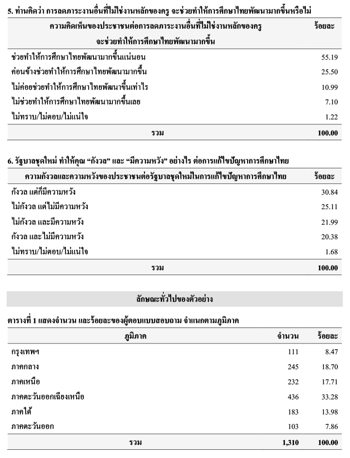 สำหรับความคิดเห็นของประชาชนต่อการลดภาระงานอื่นที่ไม่ใช่งานหลักของครู จะช่วยทำให้การศึกษาไทยพัฒนามากขึ้น พบว่า ตัวอย่าง ร้อยละ 55.19 ระบุว่า ช่วยทำให้การศึกษาไทยพัฒนามากขึ้นแน่นอน รองลงมา ร้อยละ 25.50 ระบุว่า ค่อนข้างช่วยทำให้การศึกษาไทยพัฒนามากขึ้น ร้อยละ 10.99 ระบุว่า ไม่ค่อยช่วยทำให้การศึกษาไทยพัฒนาขึ้นเท่าไร ร้อยละ 7.10 ระบุว่า ไม่ช่วยทำให้การศึกษาไทยพัฒนามากขึ้นเลย และร้อยละ 1.22ระบุว่า ไม่ทราบ/ไม่ตอบ/ไม่แน่ใจ