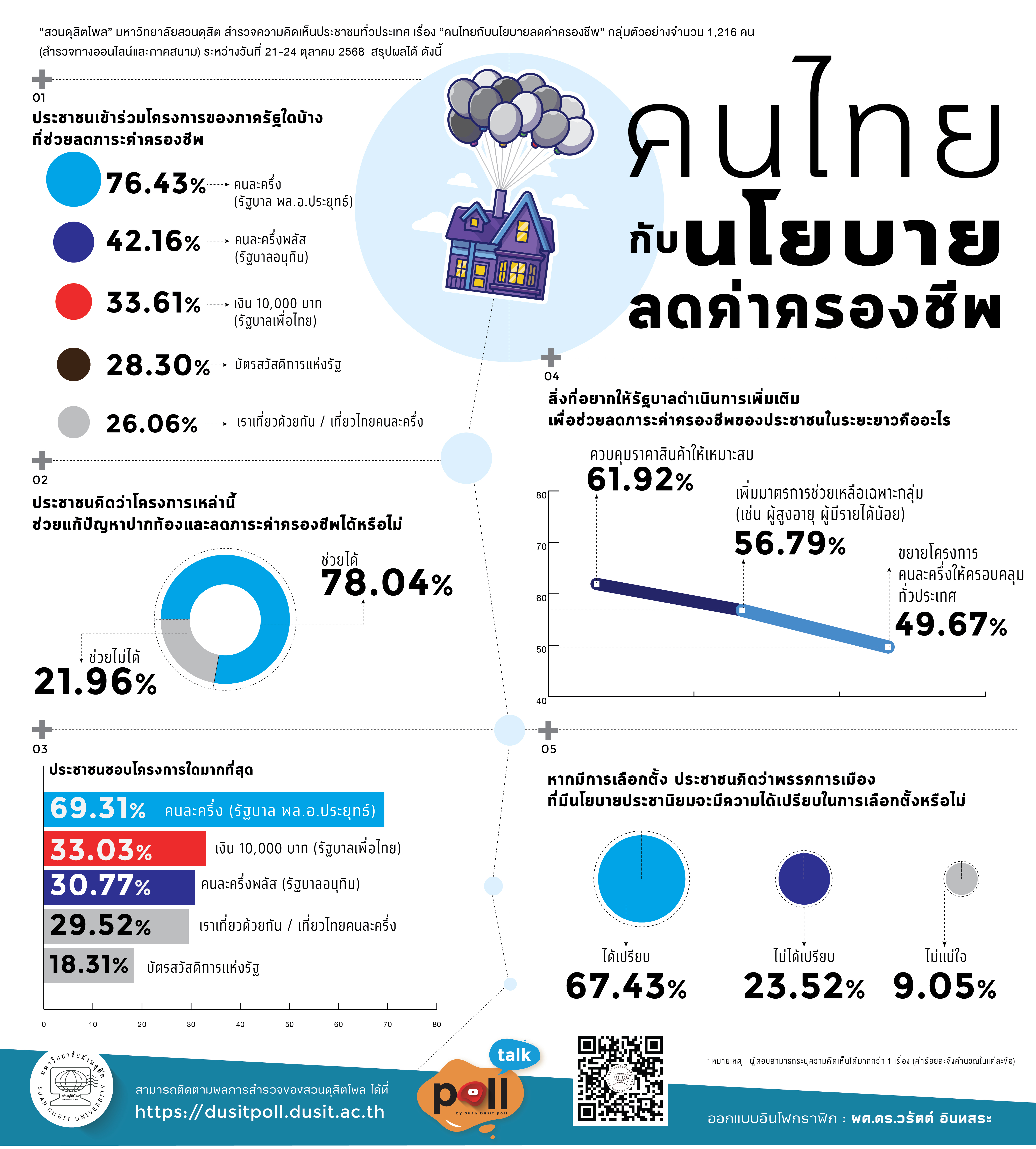 “สวนดุสิตโพล” มหาวิทยาลัยสวนดุสิต สำรวจความคิดเห็นประชาชนทั่วประเทศ เรื่อง “คนไทยกับนโยบายลด ค่าครองชีพ” กลุ่มตัวอย่าง จำนวน 1,216 คน (สำรวจทางออนไลน์และภาคสนาม) ระหว่างวันที่ 21-24 ตุลาคม 2568 พบว่า กลุ่มตัวอย่างส่วนใหญ่เข้าร่วมโครงการของภาครัฐที่ช่วยลดภาระค่าครองชีพ คือ คนละครึ่ง (รัฐบาล พล.อ.ประยุทธ์) ร้อยละ 76.43 และเห็นว่าโครงการเหล่านี้ช่วยแก้ปัญหาปากท้องและลดภาระค่าครองชีพได้ ร้อยละ 78.04 จากโครงการช่วยเหลือต่าง ๆ โครงการที่ชอบมากที่สุด คือ คนละครึ่ง (รัฐบาล พล.อ.ประยุทธ์) ร้อยละ 69.31 ในระยะยาวเพื่อลดภาระค่าครองชีพอยากให้รัฐบาลควบคุมราคาสินค้าให้เหมาะสม ร้อยละ 61.92 ทั้งนี้หากมีการเลือกตั้งคิดว่าพรรคการเมืองที่มีนโยบายประชานิยมจะได้เปรียบ ร้อยละ 67.43