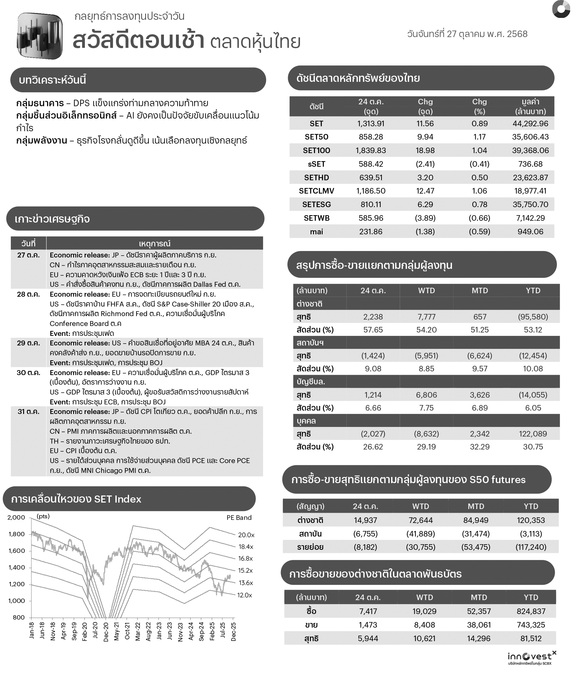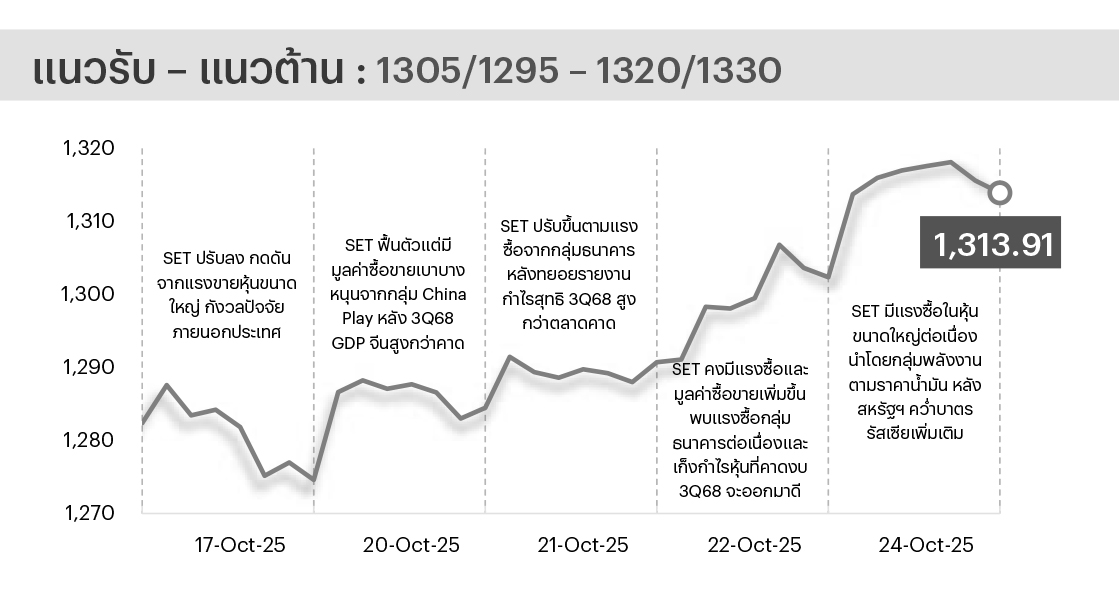 ช่วงสั้นมอง SET จะแกว่งตัวผันผวนในกรอบ 1285-1335 จุด โดยคาดตลาดจะให้น้ำหนักและติดตามปัจจัยภายนอกเป็นหลัก ได้แก่ 1) การประชุมนโยบายการเงิน FOMC ECB และ BoJ (30 ต.ค.) ซึ่งตลาดคาดเฟดจะลดดอกเบี้ยลง 25bps สู่ 4.00% มองว่าแม้ตลาดได้รับรู้ไปแล้ว แต่คาดหวังเฟดจะส่งสัญญาณลดดอกเบี้ยต่อในการประชุม ธ.ค. 2568 ขณะที่ ECB และ BoJ คาดยังมีมติคงดอกเบี้ยนโยบาย 2) หากมีการพบกันระหว่างทรัมป์และสีจิ้นผิงได้ในช่วงก่อนประชุม APEC คาดจะส่งผลบวกเชิงจิตวิทยาต่อตลาดสินทรัพย์เสี่ยง 3) งบ 3Q68 ของบจ. ขนาดใหญ่ของสหรัฐฯ ที่คาดจะออกมาดีกว่าตลาดคาด และ 4) PMI ภาคการผลิตของจีนที่ตลาดคาดจะฟื้นตัว ส่วนปัจจัยในประเทศติดตามตัวเลขส่งออกไทย ก.ย. 2568 ที่มีแนวโน้มชะลอตัวลง และการเข้าสู่ฤดูกาลประกาศงบ 3Q68 ของหุ้น Real Sector หลังงบหุ้นธนาคารส่วนใหญ่ออกมาดีกว่าตลาดคาด ดังนั้นกลยุทธ์ลงทุนจึงแนะนำให้ “Selective Buy”