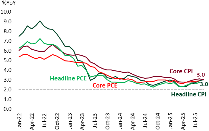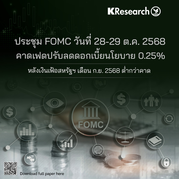 ในการประชุม FOMC วันที่ 28-29 ต.ค. 2568 คาดเฟดปรับลดดอกเบี้ยนโยบาย 0.25% ลงมาอยู่ที่ 3.75-4.00% หลังเงินเฟ้อสหรัฐฯ เดือนก.ย. ออกมาต่ำกว่าคาด แม้เฟดจะขาดข้อมูลตลาดแรงงาน เช่น ตัวเลขการจ้างงานนอกภาคเกษตร (Nonfarm Payrolls) และอัตราว่างงานในเดือนก.ย. 2568 อันเป็นผลมาจาก Government Shutdown โดยมีรายละเอียดดังต่อไปนี้