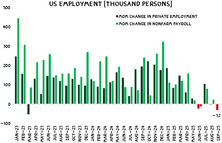 - อย่างไรก็ตาม ข้อมูลตลาดแรงงานอื่นๆ ยังชี้ไปใทศทางที่อ่อนแอลงเช่นกัน เช่น ยอดผู้ขอสวัสดิการว่างงานครั้งแรก (Jobless Claims) ในสัปดาห์ 27 ก.ย.-4 ต.ค. 2568 ปรับตัวสูงขึ้นแตะ 235,000 ราย ขณะที่ตัวเลขการจ้างงานภาคเอกชนของ ADP เดือนก.ย. 2568 ลดลงมากที่สุดในรอบสองปีครึ่ง (รูปที่ 1)