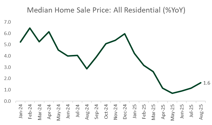 - ตลาดที่อยู่อาศัยที่ชะลอลง โดยราคาขายบ้านมัธยฐานเดือนส.ค. 2568 เพิ่มขึ้นเพียง 1.6%YoY ชะลอลงจากค่าเฉลี่ย 3.3%YoY ในไตรมาส 1/2568 (รูปที่ 3) ขณะที่ยอดขายบ้านลดลง 3.0%YoY