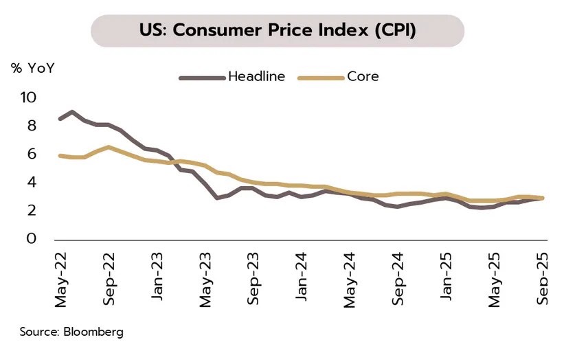 เศรษฐกิจสหรัฐฯ ยังคงเผชิญความเสี่ยงจากภาวะ Shutdown และความตึงเครียดทางการค้ากับจีน อัตราเงินเฟ้อทั่วไปของสหรัฐฯ ขยับขึ้นจากเดือนก่อนหน้าที่ 2.9% สู่ระดับสูงสุดนับตั้งแต่เดือนพฤษภาคมปี 2567 ที่ 3% YoY ในเดือนกันยายน แต่เป็นอัตราที่ต่ำกว่าตลาดคาดการณ์ ส่วนอัตราเงินเฟ้อพื้นฐานชะลอลงเล็กน้อยจากเดือนก่อนที่ 3.1% สู่ระดับ 3% ขณะที่ดัชนีความเชื่อมั่นผู้บริโภคร่วงลงสู่ระดับต่ำสุดในรอบ 5 เดือนที่ 53.6 ในเดือนตุลาคม