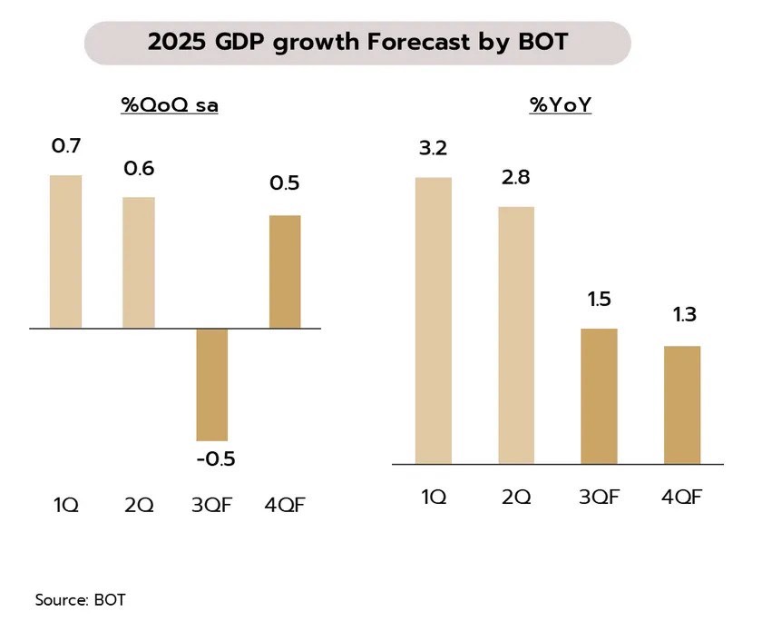 วิจัยกรุงศรีคาดดอกเบี้ยนโยบายยังมีโอกาสปรับลดลงสู่ระดับ 1.25% ภายในปลายปีนี้ ธนาคารแห่งประเทศไทย (ธปท.) ประเมินเศรษฐกิจไทยในไตรมาส 3 ของปีนี้อาจหดตัว -0.5% QoQ หรือ +1.5% YoY ก่อนจะกลับมาขยายตัว 0.5% QoQ หรือ +1.3% YoY ในไตรมาสสุดท้ายของปี ส่งผลให้ GDP ทั้งปี 2568 เติบโต 2.2% และคาดว่าจะชะลอลงเหลือ 1.6% ในปี 2569 จากผลกระทบของมาตรการภาษีนำเข้าของสหรัฐฯ ที่กดดันภาคการส่งออกมากขึ้น