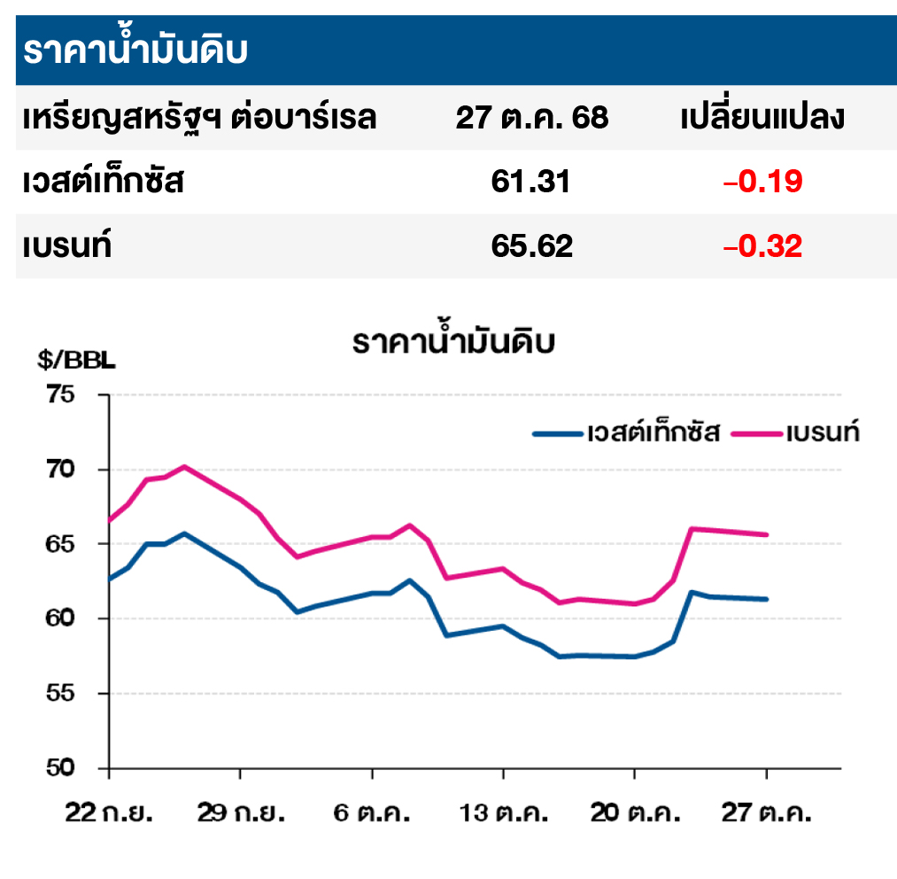 (+) ตลาดยังจับตามองถึงความสัมพันธ์ทางเศรษฐกิจระหว่างสหรัฐฯ และจีนในการประชุมของนายโดนัลด์ ทรัมป์ ประธานาธิบดีสหรัฐฯ และนายสีจิ้งผิง ประธานาธิบดีจีน ที่จะจัดขึ้นในวันที่ 30 ต.ค. 68 ที่เกาหลีใต้ หลังสงครามการค้าระหว่างสหรัฐฯ และจีนเริ่มคลายความตึงเครียดจากการบรรลุข้อตกลงในกรอบข้อตกลงเบื้องต้นจากการพบกันของ คณะเจ้าหน้าที่เศรษฐกิจของทั้งสองประเทศ ที่กัวลาลัมเปอร์ เมื่อสุดสัปดาห์ที่ผ่านมา ทั้งนี้ หากข้อตกลงดังกล่าวสามารถเห็นชอบจากผู้นำทั้งสองประเทศ จะช่วยลดความกังวลต่อภาษีศุลกากรและจะทำให้เศรษฐกิจกลับมาฟื้นตัวได้
