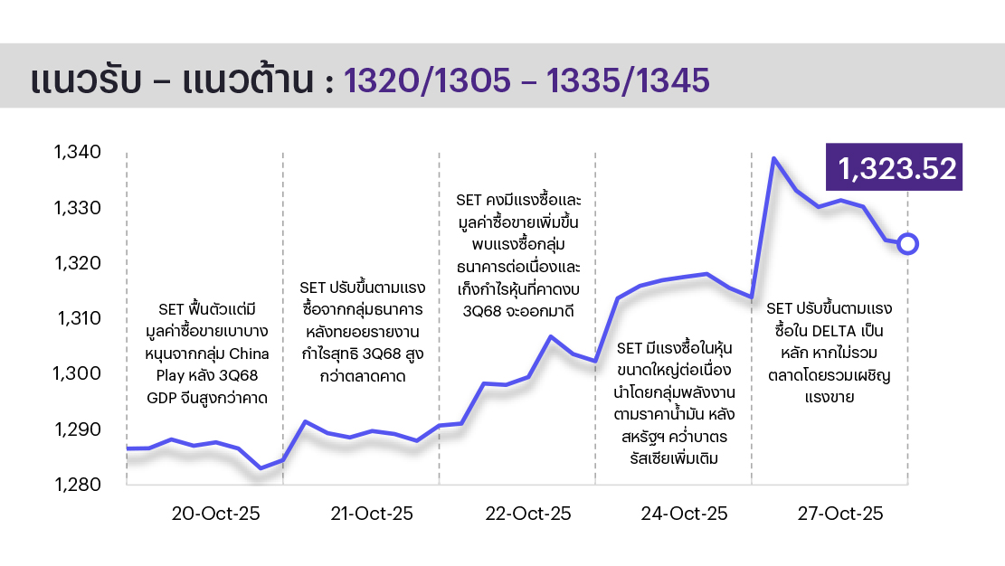 ช่วงสั้นมอง SET จะแกว่งตัวผันผวนในกรอบ 1285-1335 จุด คาดตลาดจะให้น้ำหนักและติดตามปัจจัยภายนอกเป็นหลัก ได้แก่ 1) การประชุมนโยบายการเงิน FOMC ECB และ BoJ (30 ต.ค.) ซึ่งตลาดคาดเฟดจะลดดอกเบี้ยลง 25bps สู่ 4.00% มองว่าแม้ตลาดได้รับรู้ไปแล้ว แต่คาดหวังเฟดจะส่งสัญญาณลดดอกเบี้ยต่อ ขณะที่ ECB และ BoJ คาดคงดอกเบี้ยนโยบาย 2) หากมีการพบกันระหว่างทรัมป์และสีจิ้นผิงในช่วงก่อนประชุม APEC คาดจะส่งผลบวกต่อตลาดสินทรัพย์เสี่ยง 3) งบ 3Q68 ของ บจ. ขนาดใหญ่สหรัฐฯ ที่คาดจะออกมาดีกว่าตลาดคาด และ 4) PMI ภาคการผลิตของจีนที่คาดจะฟื้นตัว ส่วนในประเทศเข้าสู่ฤดูกาลประกาศงบ 3Q68 ของหุ้น Real Sector หลังงบหุ้นธนาคารส่วนใหญ่ออกมาดีกว่าตลาดคาด ดังนั้นกลยุทธ์ลงทุนจึงแนะนำให้ “Selective Buy”