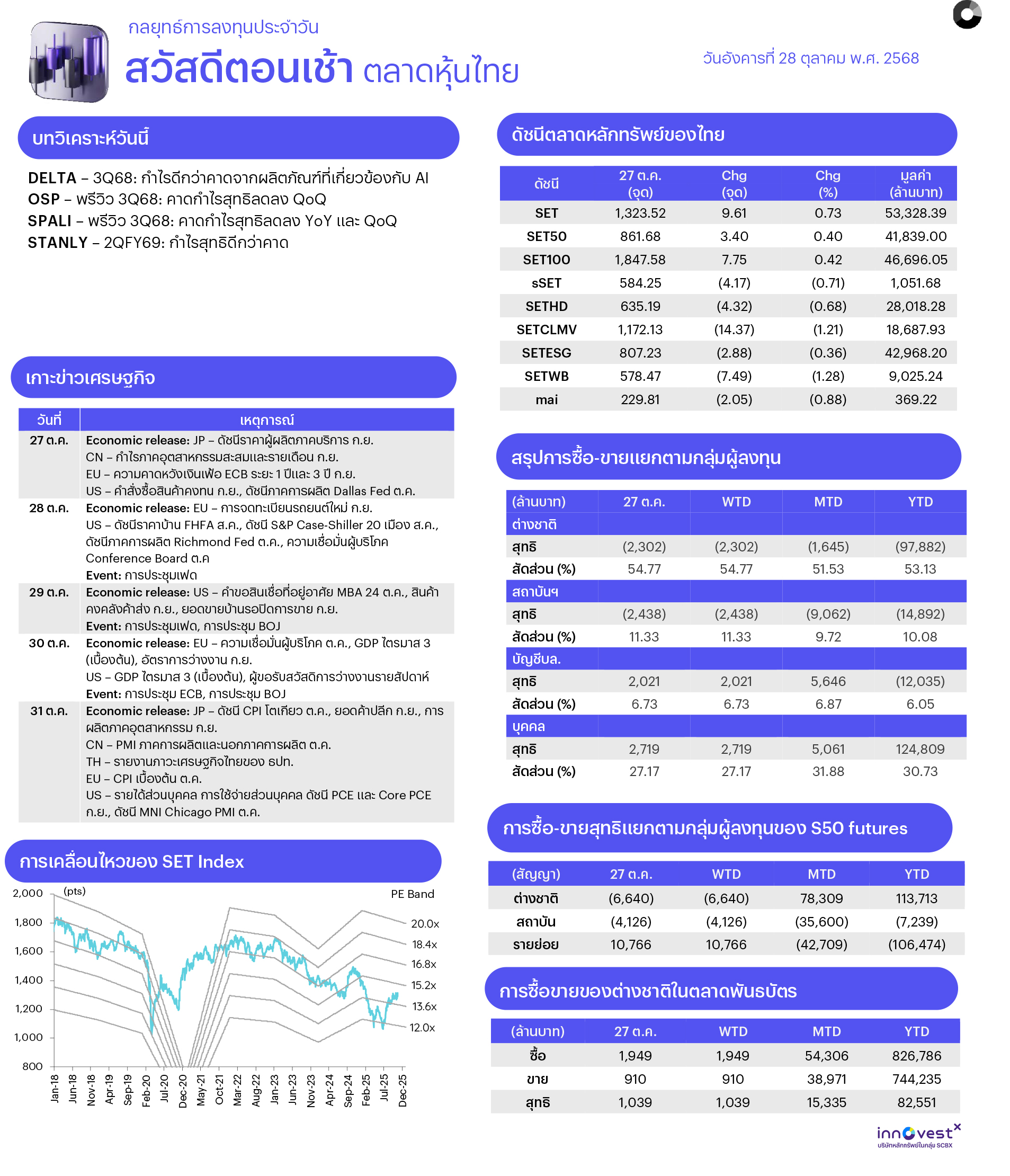 คาดตลาดแกว่งไซด์เวย์/พักตัว การขึ้นของตลาดยังมีแรงเทขายออกมา โดย DELTA เป็นตัวเดียวที่หนุนตลาดไว้หากไม่รวม DELTA ตลาดลดลง 10 จุด นักลงทุนต่างชาติเริ่มขายสุทธิพันล้านบาทเป็นวันแรก แกว่งรอผลการประชุมเฟดโดยเฉพาะในช่วงถาม-ตอบ และติดตามการพบกันระหว่าง ปธน. ทรัมป์และ ปธน. สี จิ้นผิง ทางเทคนิค ตลาดยืนเหนือ 1320 ส่งผลให้มีแรงส่ง แต่การขึ้นยังติด 1345 ระยะสั้นมีโอกาสพักตัวโดยเฉพาะหากหลุดต่ำกว่า 1320 ลงมา จะมีแนวรับถัดไปที่ 1305