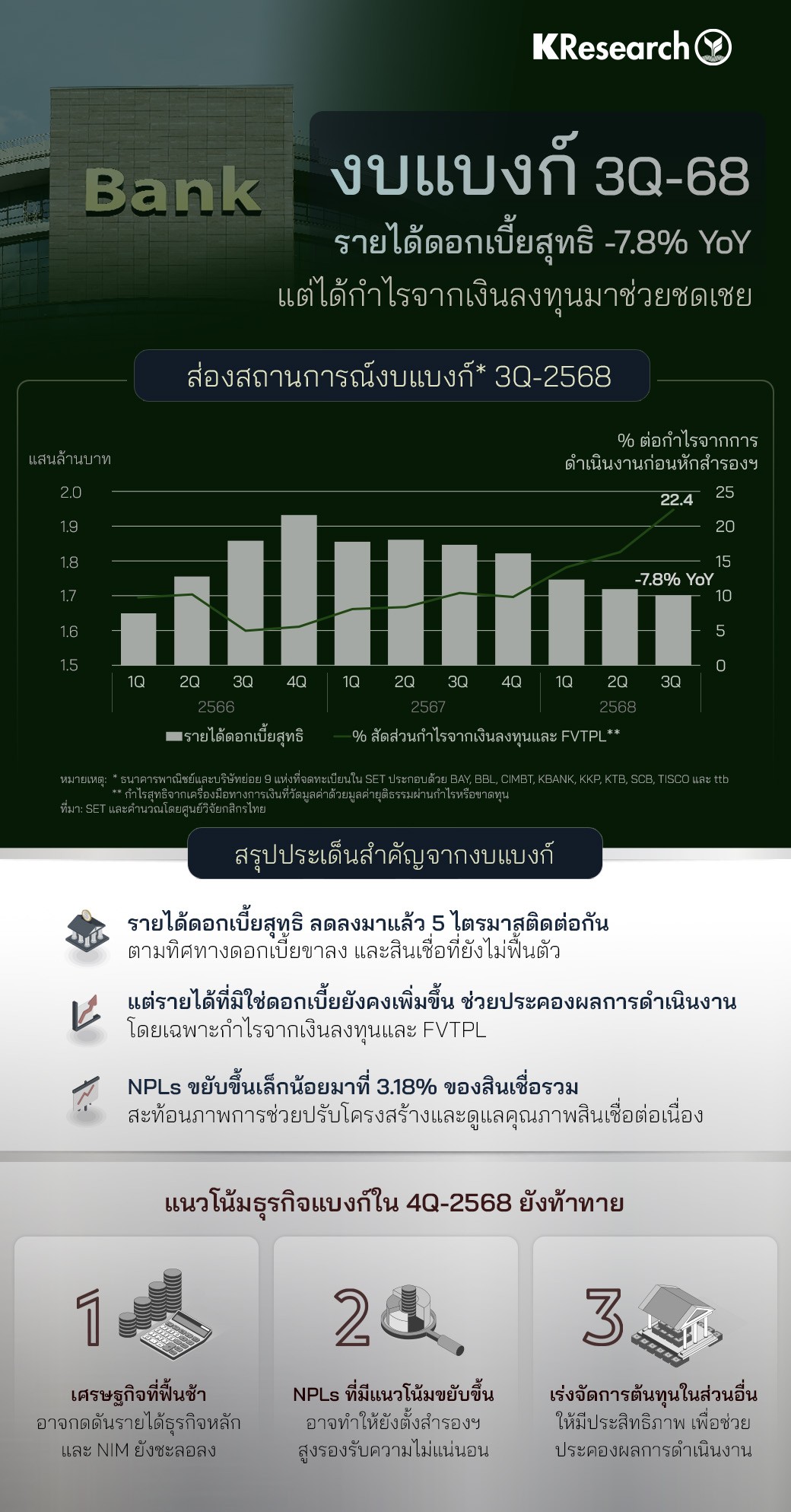 • จากการรวบรวมข้อมูลงบการเงินของกลุ่มแบงก์ 9 แห่งที่จดทะเบียนใน SET ศูนย์วิจัยกสิกรไทยพบว่า รายได้ดอกเบี้ยสุทธิหดตัวลง 7.8% YoY ใน 3Q-2568 ขณะที่ NIM ชะลอลงต่อเนื่องสอดคล้องกับทิศทางดอกเบี้ยในประเทศและสินเชื่อที่หดตัวลง อย่างไรก็ดี กลุ่มแบงก์ในภาพรวมยังสามารถประคองผลการดำเนินงานไว้ได้ เนื่องจากมีรายได้ที่มิใช่ดอกเบี้ยมาช่วยชดเชย โดยเฉพาะกำไรจากเงินลงทุนและกำไรสุทธิจากเครื่องมือทางการเงินที่วัดมูลค่าด้วยมูลค่ายุติธรรมผ่านกำไรหรือขาดทุน (FVTPL) ซึ่งกำไรทั้ง 2 ส่วนรวมกันมีสัดส่วนประมาณ 22.4% ของกำไรจากการดำเนินงานก่อนหักสำรองฯ ใน 3Q-2568