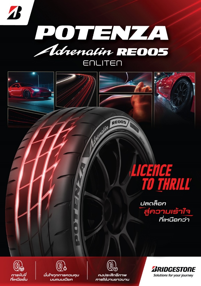 บริษัท บริดจสโตนเซลส์ (ประเทศไทย) จำกัด เปิดตัวผลิตภัณฑ์ยางรถยนต์สปอร์ตพรีเมียมรุ่นใหม่ล่าสุด “BRIDGESTONE POTENZA Adrenalin RE005” ภายใต้คอนเซปต์ “ปลดล็อกสู่ความเร้าใจที่เหนือกว่า” พร้อมให้คุณปลดปล่อยพลังความสปอร์ตเต็มพิกัด ควบคุมแม่นยำ และมั่นใจทุกการควบคุม BRIDGESTONE POTENZA Adrenalin RE005 มาพร้อมกับเทคโนโลยี ENLITENTM ของบริดจสโตน ยกระดับสมรรถนะการขับขี่อย่างเหนือชั้น คงประสิทธิภาพการใช้งานยาวนาน ทั้งยังเป็นมิตรต่อสิ่งแวดล้อม ผสานความสปอร์ตเร้าใจเข้ากับความยั่งยืนอย่างลงตัว ยางรถยนต์สปอร์ตพรีเมียมรุ่นนี้เหมาะสำหรับรถยนต์หลายประเภท เช่น รถสปอร์ต รถยนต์สมรรถนะสูง และรถยนต์ไฟฟ้า