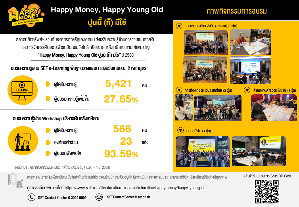 ตลาดหลักทรัพย์แห่งประเทศไทย ร่วมกับพันธมิตรภาครัฐและเอกชน จัดโครงการ “Happy Money, Happy Young Old ปูนนี้ (ก็) มีใช้” ต่อเนื่องในปี 2568 เพื่อส่งเสริมการวางแผนและบริหารเงินออมหลังเกษียณ จัดอบรมรวม 10 รุ่น แก่บุคคลทั่วไปและบุคลากรในองค์กรต่าง ๆ โครงการได้รับผลตอบรับอย่างดี โดยมีผู้ที่ได้รับความรู้ผ่าน SET e-Learning หลักสูตรพื้นฐานวางแผนการเงินวัยเกษียณกว่า 5,421 คน ซึ่งมีความรู้เพิ่มขึ้นเฉลี่ย 27.65% นอกจากนี้มีเข้าร่วมเวิร์กชอปบริหารเงินหลังเกษียณกว่า 566 คน และมีผู้รับคำแนะนำจากนักวางแผนการเงินรายบุคคล 60 คน ในกิจกรรม Financial Planning Clinic