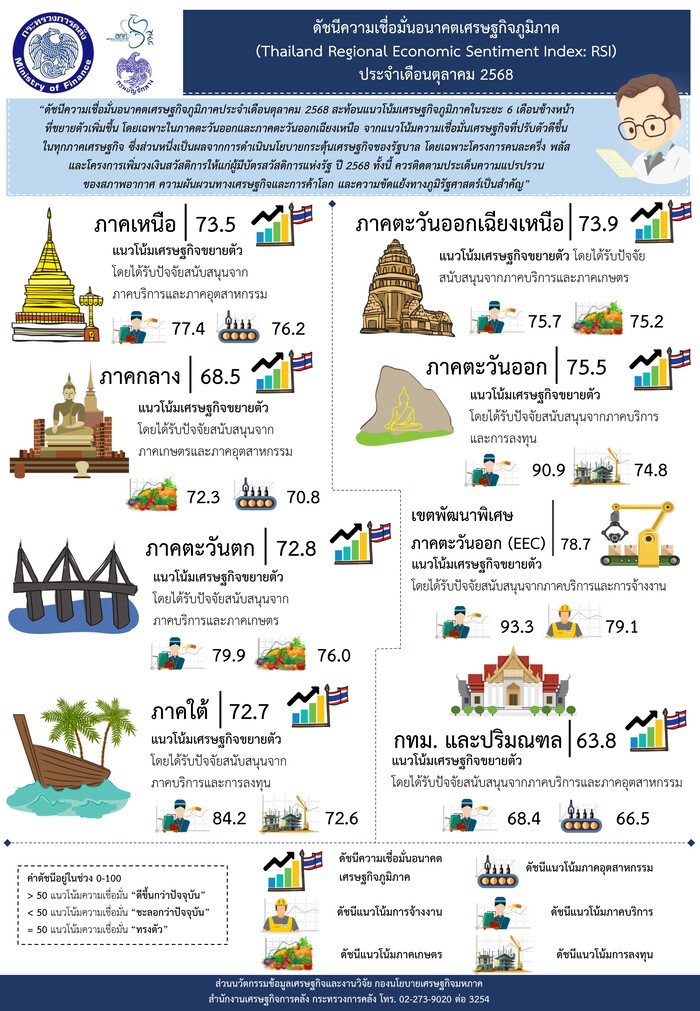 “ดัชนีความเชื่อมั่นอนาคตเศรษฐกิจภูมิภาคประจำเดือนตุลาคม 2568 สะท้อนแนวโน้มเศรษฐกิจภูมิภาคในระยะ 6 เดือนข้างหน้าที่ขยายตัวเพิ่มขึ้น โดยเฉพาะในภาคตะวันออกและภาคตะวันออกเฉียงเหนือ จากแนวโน้มความเชื่อมั่นเศรษฐกิจที่ปรับตัวดีขึ้นในทุกภาคเศรษฐกิจ ซึ่งส่วนหนึ่งเป็นผลจากการดำเนินนโยบายกระตุ้นเศรษฐกิจของรัฐบาล โดยเฉพาะโครงการคนละครึ่ง พลัส และโครงการเพิ่มวงเงินสวัสดิการให้แก่ ผู้มีบัตรสวัสดิการแห่งรัฐ ปี 2568 ทั้งนี้ ควรติดตามประเด็นความแปรปรวนของสภาพอากาศ ความผันผวนทางเศรษฐกิจและการค้าโลก และความขัดแย้งทางภูมิรัฐศาสตร์เป็นสำคัญ”