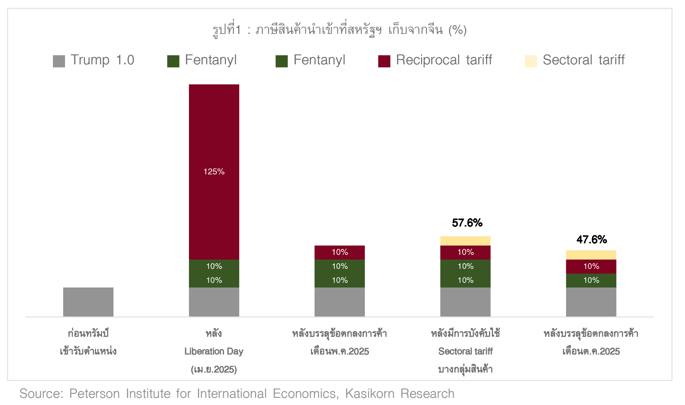 1. ภาษี Fentanyl จะถูกปรับลดลงอยู่ที่ 10% จากเดิมที่ 20% รวมถึงการยกเว้นภาษีตอบโต้จะถูกระงับเป็นระยะเวลา 1 ปี ส่งผลให้ปัจจุบันภาษีที่สหรัฐฯ เก็บจากสินค้านำเข้าจีนจะอยู่ที่ราว 47.6% (รูปที่ 1) ทั้งนี้ การระงับภาษีดังกล่าวครอบคลุมถึงเขตบริหารพิเศษฮ่องกงและมาเก๊า