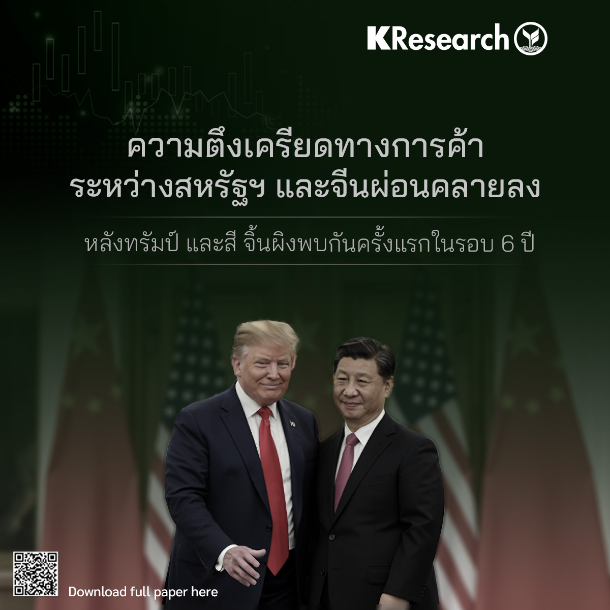 ศูนย์วิจัยกสิกรไทยมองว่าการบรรลุข้อตกลงการค้าระหว่างสหรัฐฯ และจีนล่าสุดนับเป็นการลดความตึงเครียดทางการค้าระหว่างกันเพียงชั่วคราว โดยระยะเวลา 1 ปีของการปรับลดภาษี Fentanyl และภาษีตอบโต้ระหว่างกันคาดบรรเทาผลกระทบของภาคธุรกิจได้เพียงบางส่วน ขณะที่ธุรกิจทั้งฝั่งสหรัฐฯ และจีนจะยังคงเตรียมการปรับตัว ย้ายฐานการผลิต รวมถึงขยายตลาดไปประเทศอื่น ๆ นอกจากนี้ สงครามเทคโนโลยีจะเป็นอีกประเด็นที่ยังต้องติดตาม ทั้งนี้ ผลต่อการส่งออก และเศรษฐกิจจีน มีรายละเอียด ดังนี้