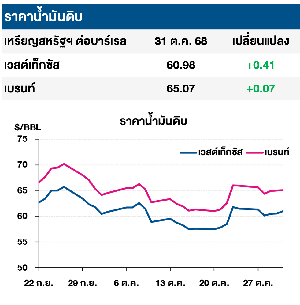 (-) สำนักข่าว Reuters เปิดเผยว่าซาอุดิอาระเบียซึ่งเป็นหนึ่งในประเทศที่ส่งออกน้ำมันดิบมากที่สุดในโลกอาจลดราคาน้ำมันดิบเดือน ธ.ค.68 สำหรับประเทศในเอเชียลง ขณะที่ตลาดจับตาการประชุมกลุ่ม OPEC+ ที่จะจัดขึ้นวันที่ 2 พ.ย. 68 โดยตลาดคาดการณ์ว่าจะปรับเพิ่มกำลังการผลิตน้ำมันดิบ เดือน ธ.ค. 68 ที่ระดับ 0.137 ล้านบาร์เรลต่อวัน อย่างต่อเนื่องแม้นักวิเคราะห์มองว่าหลายประเทศในกลุ่มยกเว้นซาอุดิอาระเบีย ไม่สามารถเพิ่มกำลังการผลิตน้ำมันดิบได้มากนักก็ตาม