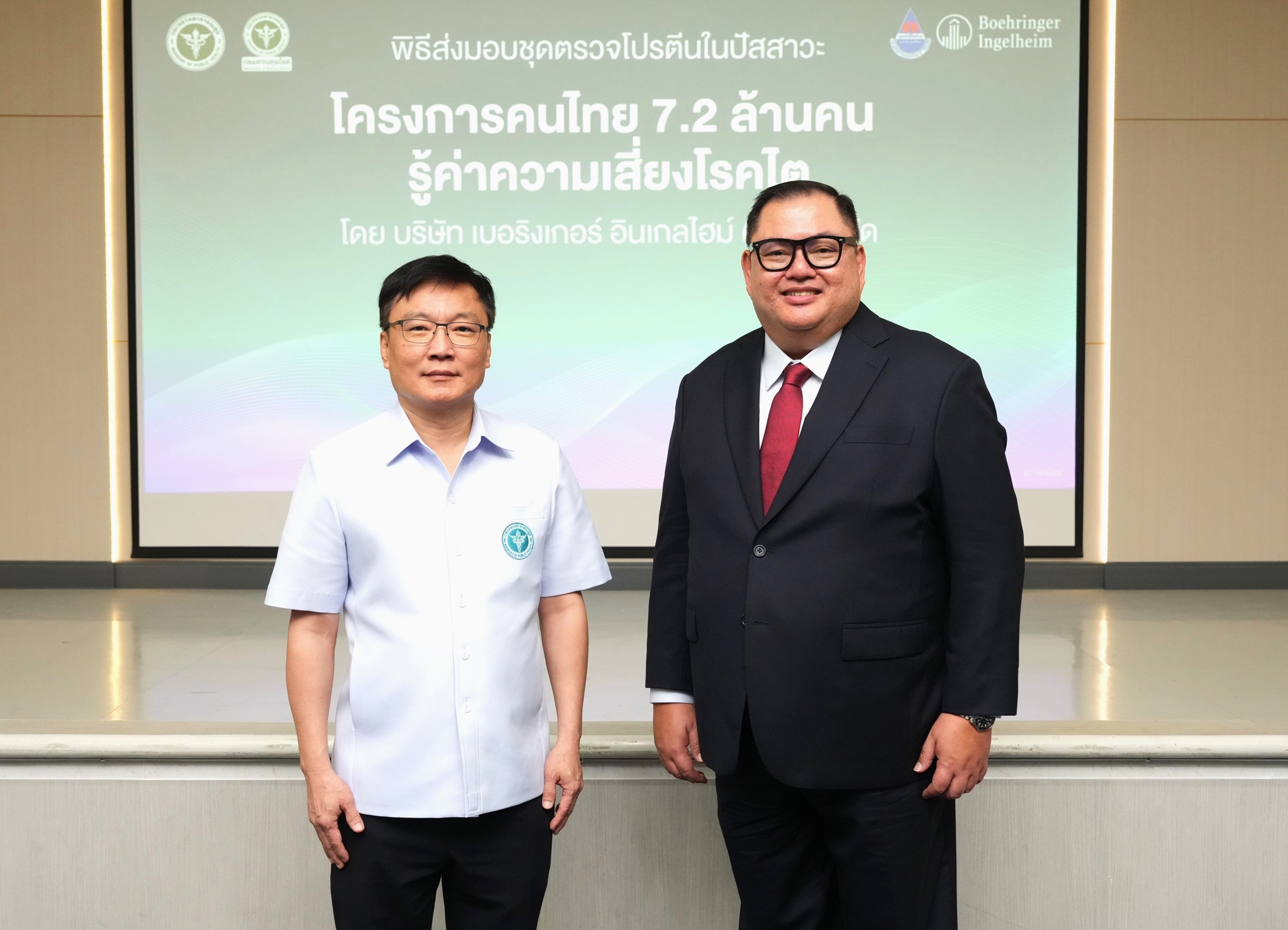 บริษัท เบอริงเกอร์ อินเกลไฮม์ (ไทย) จำกัด ตอกย้ำความมุ่งมั่นในการยกระดับสุขภาพคนไทยอย่างยั่งยืน ด้วยการส่งมอบชุดตรวจโปรตีนในปัสสาวะ (Microalbuminuria strip test) ให้แก่ กองโรคไม่ติดต่อ กรมควบคุมโรค กระทรวงสาธารณสุข และเขตสุขภาพต่าง ๆ ในประเทศไทย โดยจัดพิธีส่งมอบ ณ โรงพยาบาลพัทยาปัทมคุณ จังหวัดชลบุรี เพื่อสนับสนุนการดำเนินงานของโครงการ “คนไทย 7.2 ล้านคน รู้ค่าความเสี่ยงโรคไต” เพื่อเฉลิมพระเกียรติสมเด็จพระกนิษฐาธิราชเจ้า กรมสมเด็จพระเทพรัตนราชสุดาฯ สยามบรมราชกุมารี ในโอกาสทรงเจริญพระชนมายุ 72 พรรษา โดยมีเป้าหมายให้คนไทย 7.2 ล้านคน ได้รับการตรวจคัดกรองความเสี่ยงโรคไตตั้งแต่ระยะเริ่มต้น ลดภาระค่าใช้จ่ายในการรักษาโรคไต และชะลอการเกิดภาวะไตวายระยะสุดท้าย สอดคล้องกับแนวทางของแผนทศวรรษการป้องกันและชะลอไตเสื่อม พ.ศ. 2565–2574 ของกระทรวงสาธารณสุข ที่เน้นการดูแลสุขภาพเชิงป้องกันเพื่อลดภาระของโรคไตเรื้อรังในระยะยาว