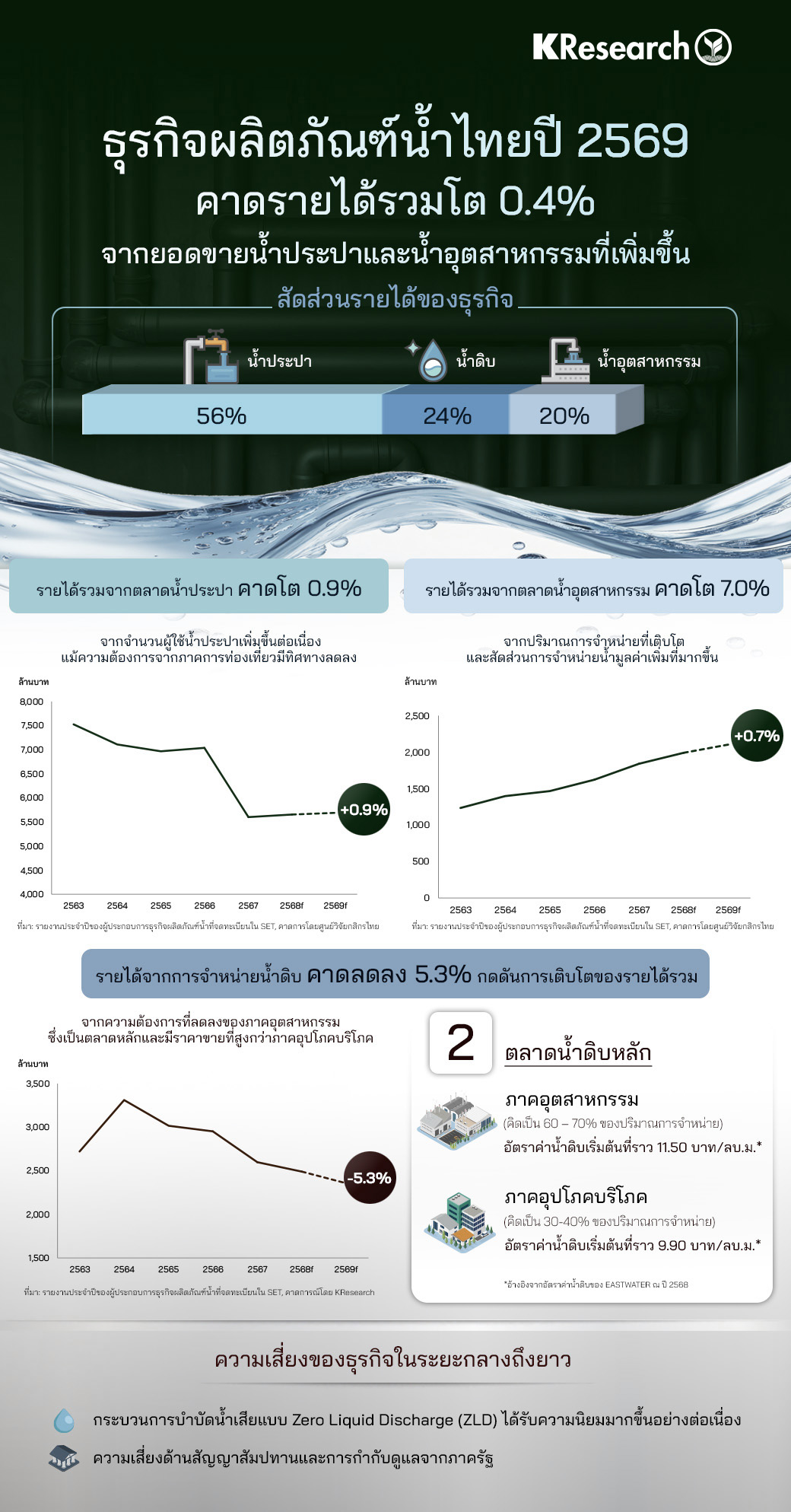 · อย่างไรก็ดี น้ำดิบเป็นผลิตภัณฑ์เดียวที่รายได้จากการจำหน่ายในปี 2569 มีแนวโน้มลดลง โดยคาดว่าจะหดตัวราว 5.3% จากอุปสงค์ที่ลดลงของภาคอุตสาหกรรม ซึ่งเป็นตลาดหลักและมีราคาขายที่สูงกว่าภาคอุปโภคบริโภค1