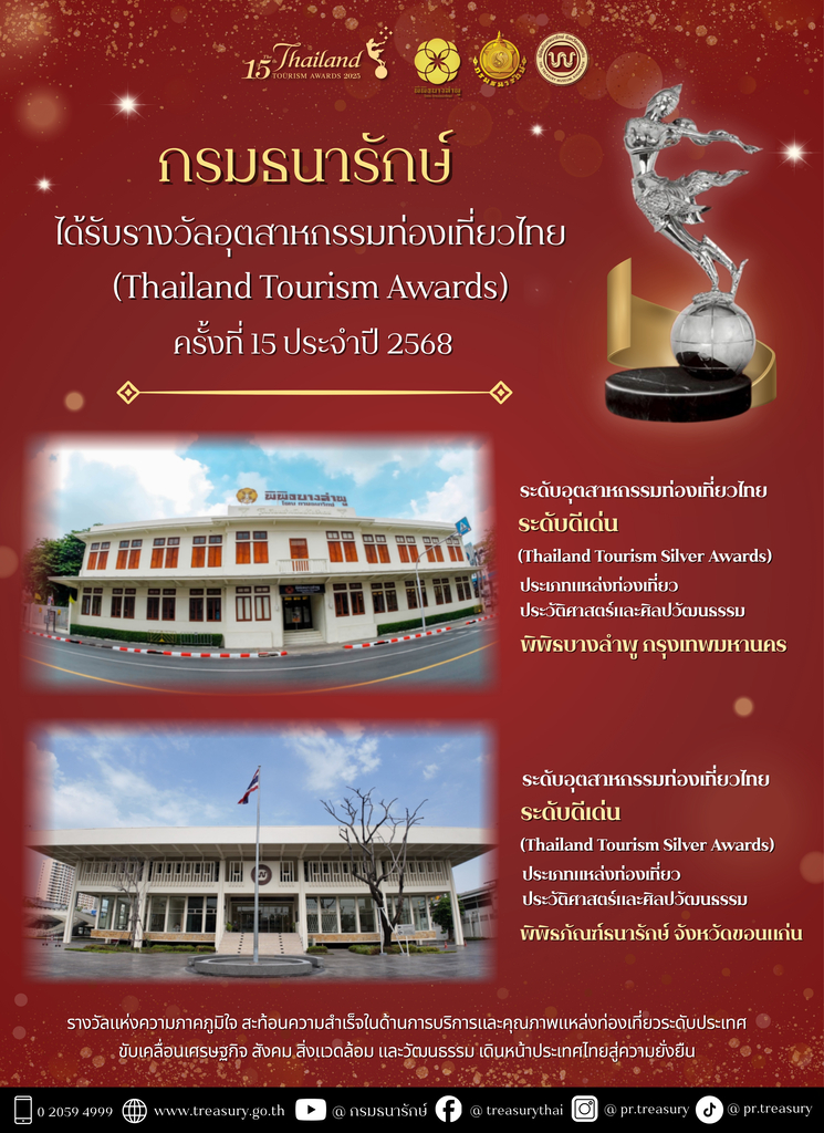 นายบุญชอบ วิเศษปรีชา โฆษกกรมธนารักษ์ เปิดเผยว่าพิพิธบางลำพูและพิพิธภัณฑ์ธนารักษ์ จังหวัดขอนแก่น ได้รับรางวัลดีเด่น (Thailand Tourism Outstanding Awards) ประเภทแหล่งท่องเที่ยว สาขาแหล่งท่องเที่ยวประวัติศาสตร์และศิลปวัฒนธรรม (Historical Arts & Culture) โดยทูลกระหม่อมหญิงอุบลรัตนราชกัญญา สิริวัฒนาพรรณวดี เสด็จเป็นองค์ประธาน พระราชทานรางวัลในงานพิธีพระราชทานรางวัลอุตสาหกรรมท่องเที่ยวไทย (Thailand Tourism Awards) ครั้งที่ 15 ประจำปี 2568 หรือรางวัล “กินรี” จัดโดยการท่องเที่ยวแห่งประเทศไทย