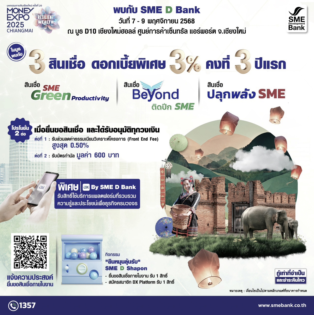 ธนาคารพัฒนาวิสาหกิจขนาดกลางและขนาดย่อมแห่งประเทศไทย (ธพว.) หรือ SME D Bank เข้าร่วมงานมหกรรมการเงินเชียงใหม่ ครั้งที่ 20 (MONEY EXPO 2025 CHIANGMAI) ระหว่างวันที่ 7-9 พฤศจิกายน 2568 ณ บูธ D10 เชียงใหม่ฮอลล์ เซ็นทรัลแอร์พอร์ต เชียงใหม่ จังหวัดเชียงใหม่ ยกทัพบริการ “พัฒนาคู่เติมทุน” สนับสนุนให้ผู้ประกอบการเอสเอ็มอี คว้าโอกาสธุรกิจเติบโตและต่อยอดจากนโยบาย Quick Big Win ของรัฐบาล ที่มุ่ง “กระตุ้นสั้น ได้ยาว กระจายตัว” เช่น โครงการคนละครึ่งพลัส และมาตรการกระตุ้นการท่องเที่ยว เป็นต้น ด้วยโปรโมชัน ด้านการเงิน ผ่านผลิตภัณฑ์สินเชื่ออัตราดอกเบี้ยต่ำพิเศษเพียง 3% ต่อปี คงที่ตลอด 3 ปีแรก ผ่อนชำระนานสูงสุด 10 ปี ครอบคลุมทุกความต้องการและทุกกลุ่มธุรกิจเอสเอ็มอี   ได้แก่ 1.สินเชื่อ “SME Green Productivity” วงเงินกู้สูงสุด 10 ล้านบาท  2.สินเชื่อ “ปลุกพลัง SME” วงเงินกู้สูงสุด 1.5 ล้านบาท และ 3.สินเชื่อ “Beyond ติดปีก SME” วงเงินกู้สูงสุด 15 ล้านบาท ควบคู่บริการ ด้านการพัฒนา เพิ่มศักยภาพธุรกิจเอสเอ็มอี ด้วยแพลตฟอร์ม DX by SME D Bank (dx.smebank.co.th) ช่วย Upskill Reskill เรียนรู้ได้ด้วยตัวเอง ตลอด 24 ชม. รวมทั้ง ให้คำปรึกษาแก้ปัญหาหนี้อย่างยั่งยืน ช่วยเหลือผู้ประกอบการเอสเอ็มอีกลุ่มเปราะบาง พลิกฟื้นกิจการกลับมาเดินหน้าได้อีกครั้ง ผ่านมาตรการ  “3 ลด ปลดหนี้” เป็นต้น