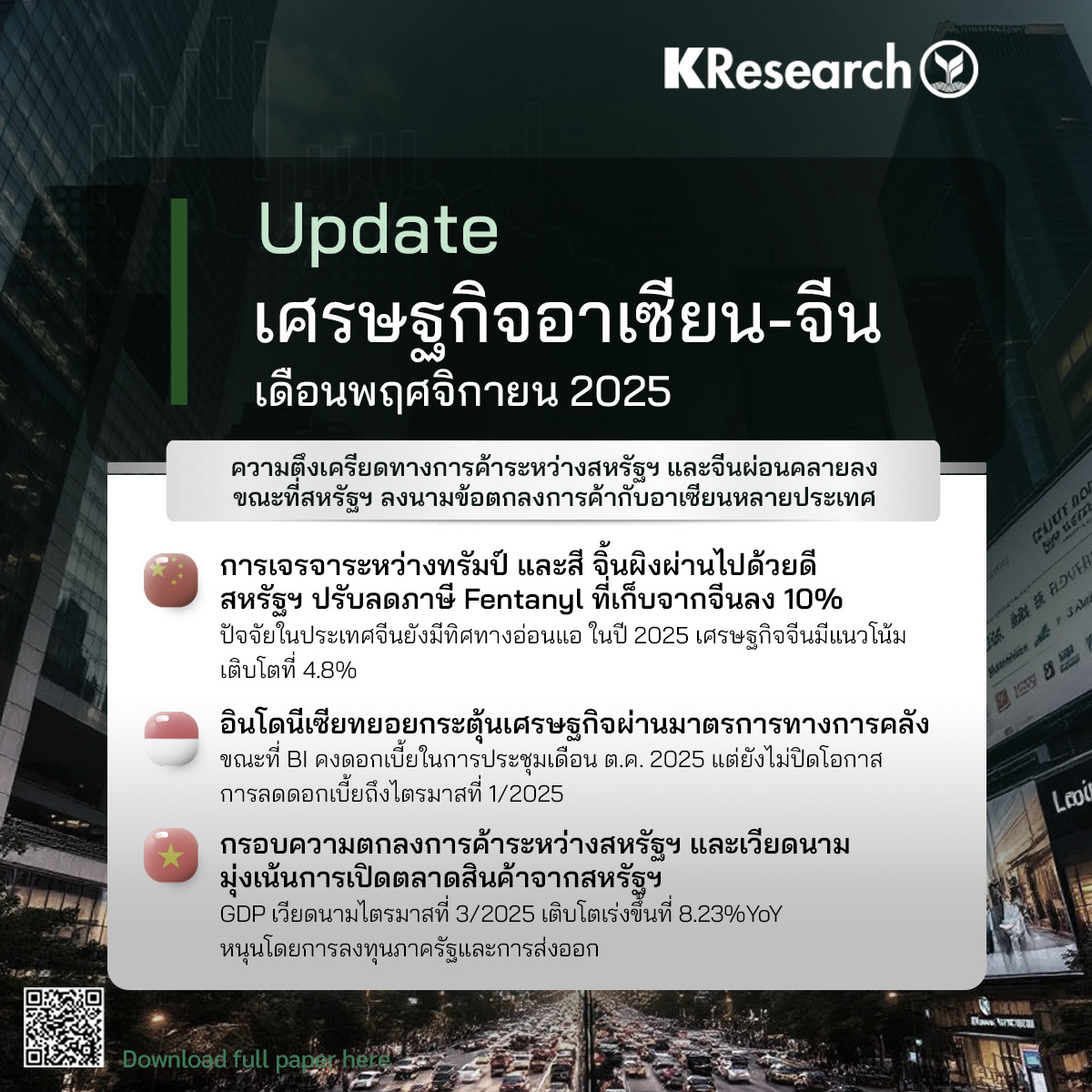 • การเจรจาระหว่างทรัมป์ และสี จิ้นผิงผ่านไปด้วยดี สหรัฐฯ ปรับลดภาษี Fentanyl ที่เก็บจากจีนลง 10% ปัจจัยในประเทศจีนยังมีทิศทางอ่อนแอ ในปี 2025 เศรษฐกิจจีนมีแนวโน้มเติบโตที่ 4.8%