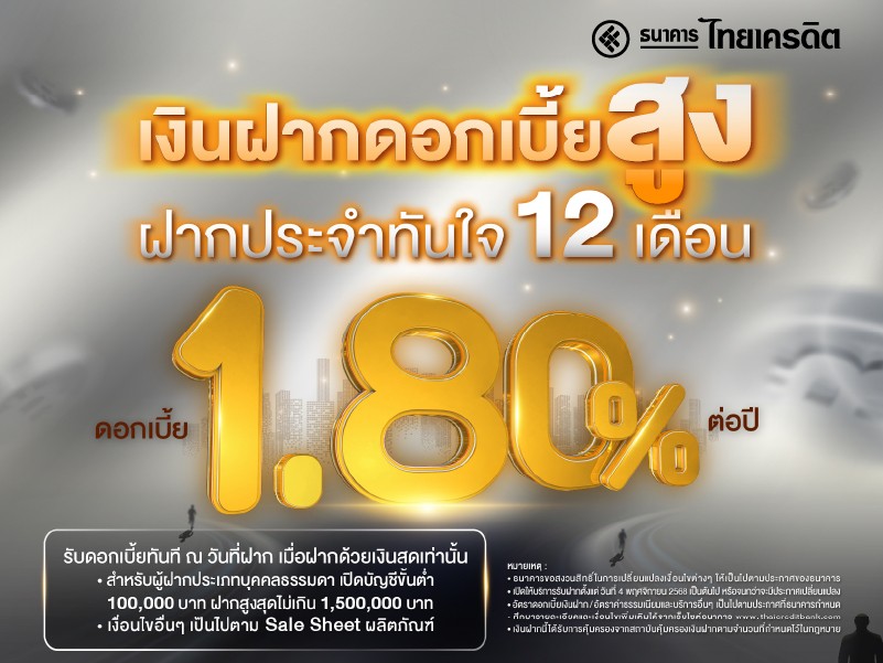 ท่ามกลางกระแสดอกเบี้ยเงินฝากที่ปรับลดลง ธนาคารไทยเครดิต จำกัด (มหาชน) ปรับดอกเบี้ยให้ตอบโจทย์นักออมที่มองหาผลตอบแทนอย่างคุ้มค่าและทันที เปิดตัวโปรโมชันใหม่สวนกระแสตลาดเงินฝาก ด้วย “บัญชีเงินฝากประจำทันใจ 12 เดือน” มอบอัตราดอกเบี้ยสูงถึง 1.80% ต่อปี และ สามารถรับดอกเบี้ยทันทีในวันฝาก ส่งเสริมการวางแผนเก็บเงินเพื่อนำไปใช้ต่อยอดหรือเสริมสภาพคล่องอย่างมั่นคง