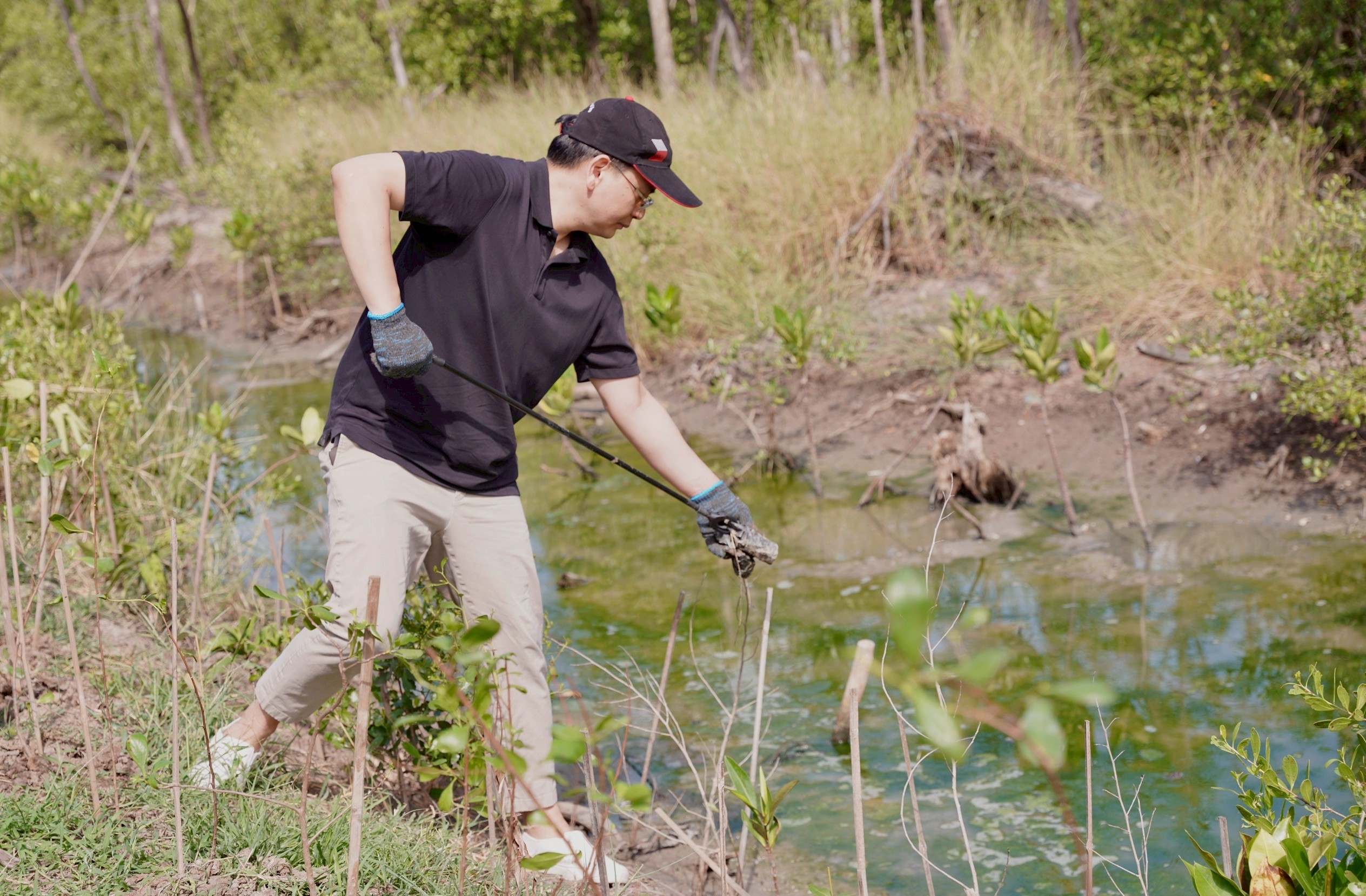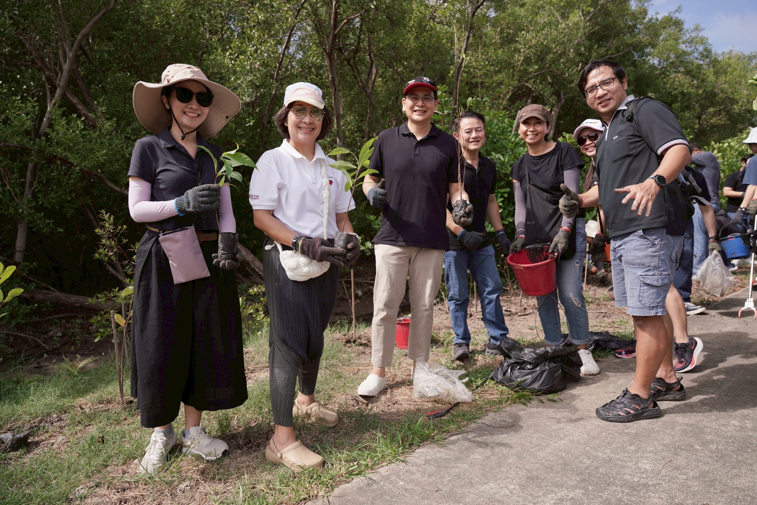 นอกจากนี้ พนักงานฝ่ายบริหารความเสี่ยง ยังได้ร่วมกันบริจาคเรือดูดตะกอน เพื่อใช้ในการดูดเลนจากพื้นที่ชุ่มน้ำขึ้นมาเป็นปุ๋ยบำรุงต้นไม้ และช่วยเพิ่มประสิทธิภาพในการกักเก็บน้ำ อันจะช่วยฟื้นฟูระบบนิเวศให้กลับคืนสู่ความสมบูรณ์อย่างยั่งยืน อีกทั้งทีมจิตอาสายังช่วยกันเก็บขยะแนวรอบป่าชายเลนด้วย