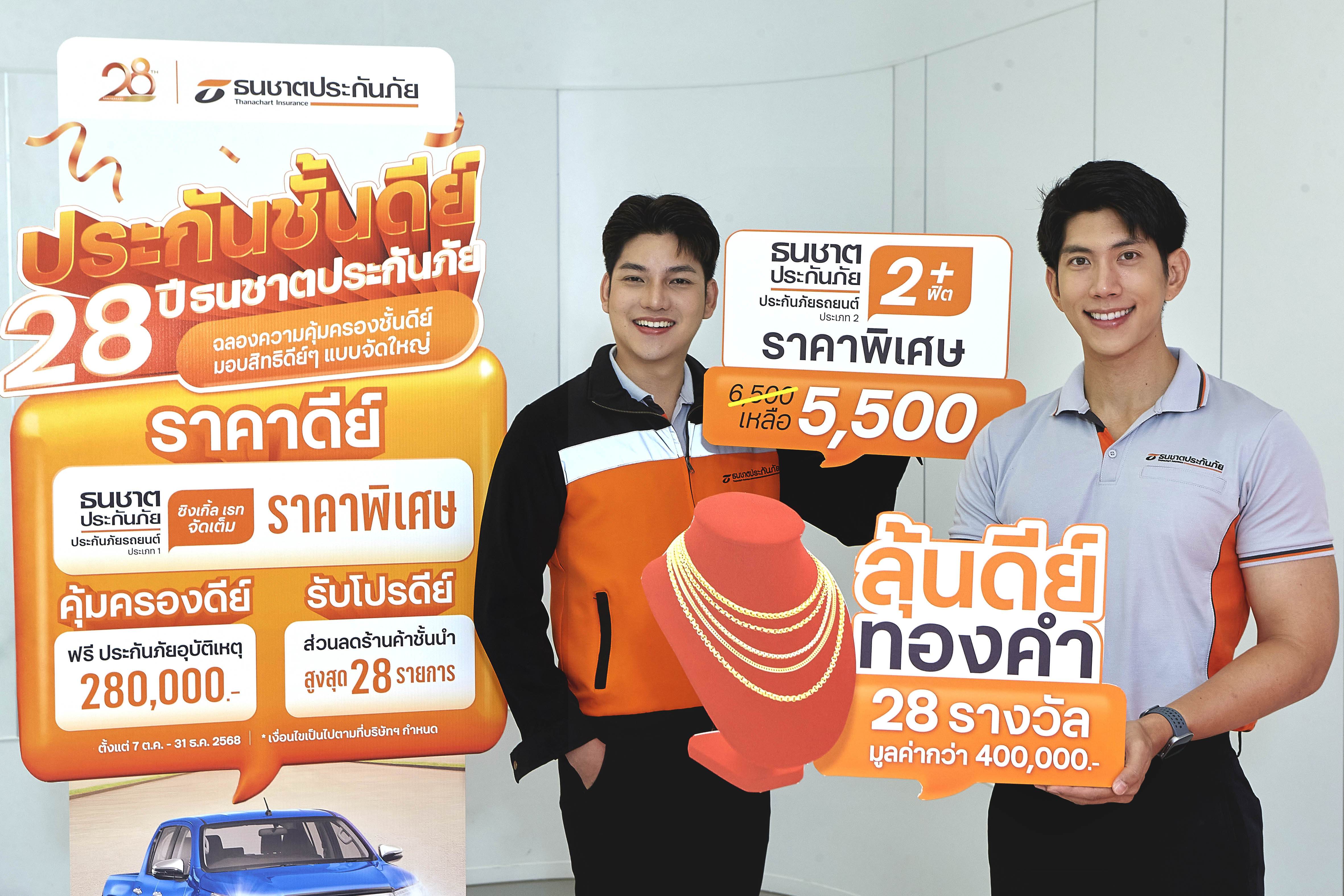 ธนชาตประกันภัย ฉลองครบรอบ 28 ปี จัดแคมเปญสุดพิเศษ “ประกันชั้นดีย์” รวมที่สุดของความคุ้มไว้ในหนึ่งเดียว ให้ลูกค้าทั่วไทยได้รับความคุ้มค่าจัดเต็มกว่าที่เคย กับข้อเสนอแรงแห่งปีได้ทั้ง ราคาดีย์! จาก 2 ผลิตภัณฑ์ยอดฮิต “ประกันภัยรถยนต์ ธนชาต ชั้น 1 ซิงเกิลเรท จัดเต็ม” ราคาพิเศษ และ “ประกันภัยรถยนต์ ธนชาต 2+ ฟิต” ราคาเริ่มต้นเพียง 5,500 บาท พร้อม คุ้มครองดีย์! รับฟรี ประกันอุบัติเหตุส่วนบุคคล คุ้มครองสูงสุด 280,000 บาท ต่อด้วย โปรดีย์! สิทธิพิเศษส่วนลดจากร้านค้าชั้นนำทั่วประเทศกว่า 28 รายการ และปิดท้ายด้วย ลุ้นดีย์! ทองคำรวม 28 รางวัล มูลค่ากว่า 400,000 บาท ซึ่งสนับสนุนของรางวัลโดย บริษัท อาร์ที โทเทิล เซอร์วิส จำกัด เพียงซื้อหรือต่ออายุกรมธรรม์ที่ร่วมรายการ มูลค่าเบี้ยตั้งแต่ 3,000 บาทขึ้นไป ร่วมฉลองความคุ้มและอุ่นใจไปกับธนชาตประกันภัยได้ตั้งแต่วันนี้ - 31 ธันวาคม 2568 ผ่านทุกช่องทาง ทั้งเว็บไซต์ www.thanachartinsurance.co.th ติดต่อเจ้าหน้าที่ โทร. 1519 หรือโบรกเกอร์ต่าง ๆ ทั่วประเทศ