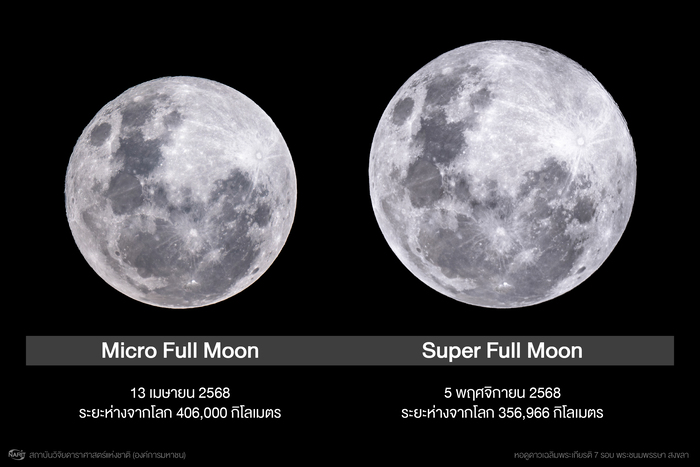 สถาบันวิจัยดาราศาสตร์แห่งชาติ (องค์การมหาชน) (NARIT) กระทรวงการอุดมศึกษา วิทยาศาสตร์ วิจัย และนวัตกรรม (อว.) เผยภาพดวงจันทร์เต็มดวงใกล้โลกที่สุดในรอบปี “ซูเปอร์ฟูลมูน” (Super Full Moon) คืน 5 พฤศจิกายน 2568 ระยะห่างจากโลกประมาณ 356,966 กิโลเมตร คืนดังกล่าวดวงจันทร์เต็มดวงมีขนาดปรากฏใหญ่กว่าปกติเล็กน้อย เมื่อนำภาพถ่ายมาเปรียบเทียบขนาดปรากฏของดวงจันทร์เต็มดวงช่วงใกล้-ไกลโลกที่สุดในรอบปี จะมีขนาดปรากฏใหญ่กว่าประมาณ 14% เห็นความแตกต่างได้อย่างชัดเจน
