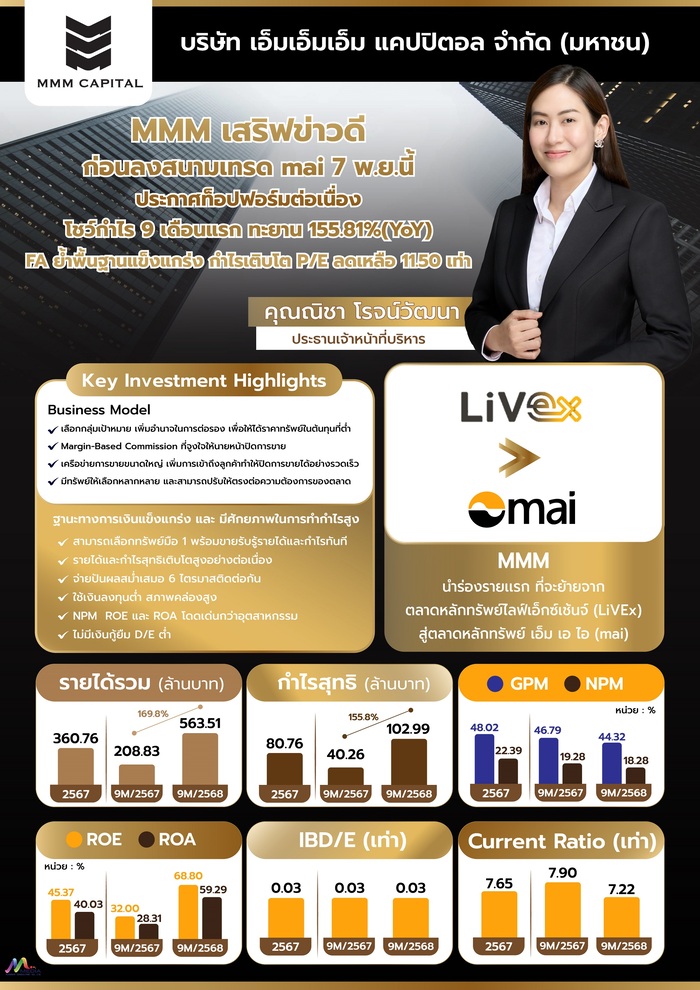 บมจ.เอ็มเอ็มเอ็ม แคปปิตอล หรือ MMM ฟอร์มเจ๋ง ประกาศข่าวดีก่อนย้ายบ้านจากตลาดไลฟ์เอ็กซ์เช้นจ์ (LiVEx) สู่ ตลาดหลักทรัพย์เอ็ม เอ ไอ (mai ) วันที่ 7 พ.ย.นี้ โชว์กำไรสุทธิงวด 9 เดือนแรก พุ่ง 102.99 ล้านบาท เพิ่มขึ้น 155.81%(YoY) ขณะที่รายได้จากการขายและบริการ 561.79 ล้านบาท เพิ่มขึ้น 171.51%(YoY) ด้าน FA พร้อมตอกย้ำ MMM ศักยภาพทางการเงินแข็งแกร่ง โดย ณ สิ้นเดือนก.ย. โดยมีอัตราส่วนสภาพคล่องที่ 7.22 เท่า อัตราผลตอบแทนผู้ถือหุ้น (ROE) ที่ 68.80 เท่า อัตราผลตอบแทนจากสินทรัพย์ (ROA) ที่ 59.29 เท่า และหนี้สินที่มีภาระดอกเบี้ยต่อส่วนผู้ถือหุ้น (IBD/E) ที่ 0.03 เท่า โดย P/E จาก 13.49 เท่า จะลดลงเหลือ 11.50 เท่า มั่นใจเข้าเทรดวันพรุ่งนี้ (7พ.ย.68) นักลงทุนให้การตอบรับดี