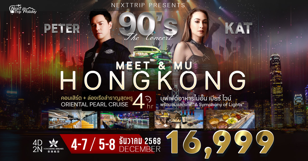 Next Trip Holiday ผู้จัดทริปท่องเที่ยวและประสบการณ์พิเศษสำหรับนักเดินทาง เปิดตัวแพ็คเกจสุดเอ็กซ์คลูซีฟ “Meet & Mu Hongkong – 90’s The Concert” พาบินตรงสู่ฮ่องกงเพื่อร่วมกิจกรรมใกล้ชิดกับสองศิลปินจากยุค 90’s ชื่อดัง Peter และ Kat พร้อมดินเนอร์ล่องเรือหรู Oriental Pearl Cruise ชมวิวอ่าววิคตอเรียและโชว์แสงสีระดับโลก A Symphony of Lights ในแบบส่วนตัว