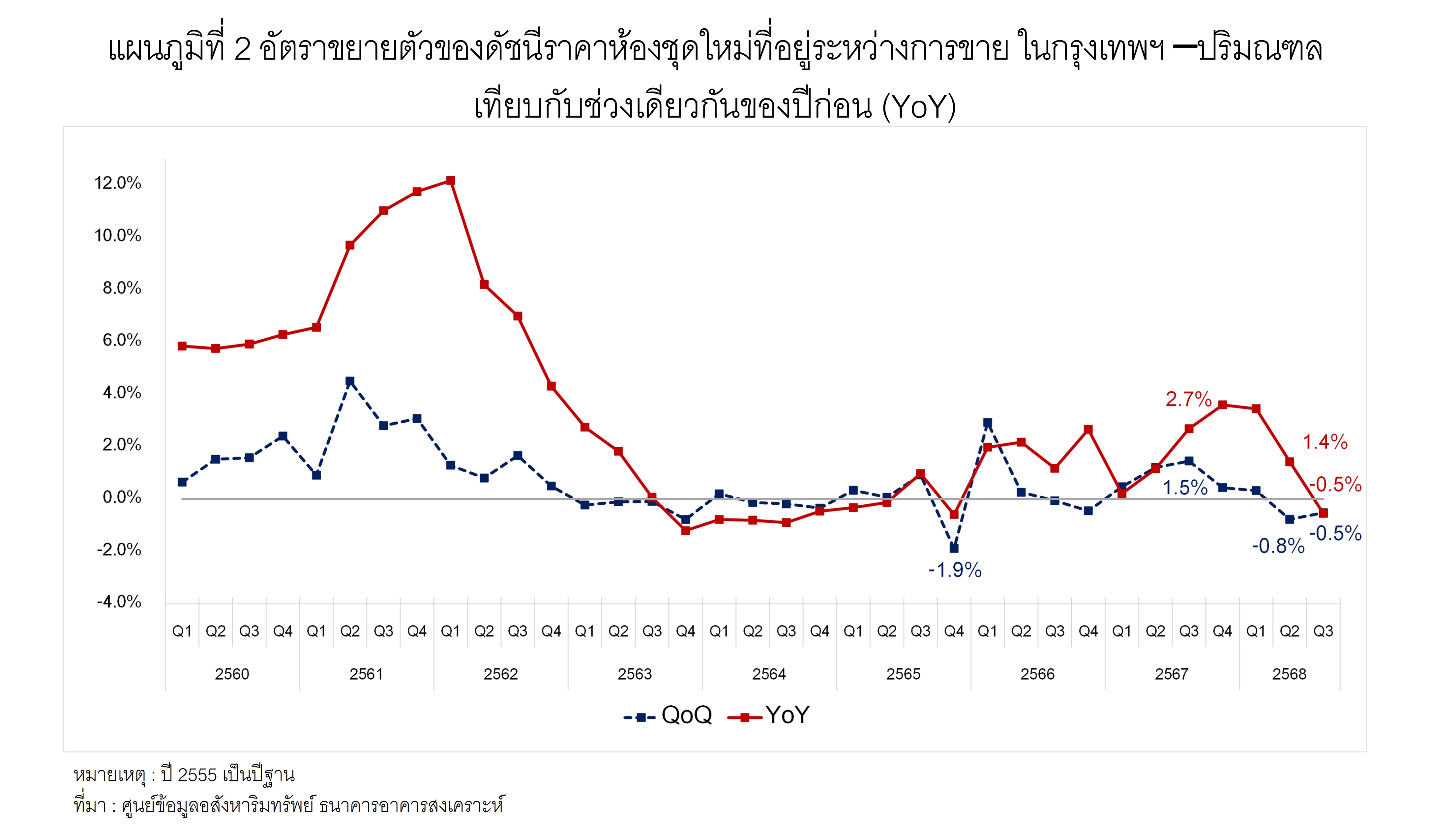 ห้องชุดใหม่ที่อยู่ระหว่างการขาย ไตรมาส 3 ปี 2568 ในกรุงเทพฯ – ปริมณฑล” มีค่าดัชนีเท่ากับ 158.3 จุด ลดลงร้อยละ -0.5 เมื่อเทียบกับช่วงเดียวกันของปีก่อน (YoY) และลดลงร้อยละ -0.5 เมื่อเทียบกับไตรมาสก่อน (QoQ) สะท้อนให้เห็นราคาห้องชุดมีการปรับตัวลดลงต่อเนื่อง 2 ไตรมาส ตั้งแต่ไตรมาส 2 ปี 2568 การปรับลดราคาดังกล่าวเป็นผลจากอุปทานห้องชุดเหลือขายมีจำนวนเพิ่มขึ้น ในขณะที่ยอดขายชะลอตัวลง ทำให้ผู้ประกอบการต้องทำการตลาด ระบายสต็อก ซึ่งในไตรมาสนี้ การให้ของสมนาคุณสูงถึงร้อยละ 44.3 การให้ฟรีค่าใช้จ่ายในวันโอนกรรมสิทธิ์มีสัดส่วนเพิ่มขึ้นจากร้อยละ 21.4 เป็นร้อยละ 32.4 และส่วนลดเงินสดมีสัดส่วนร้อยละ 23.3