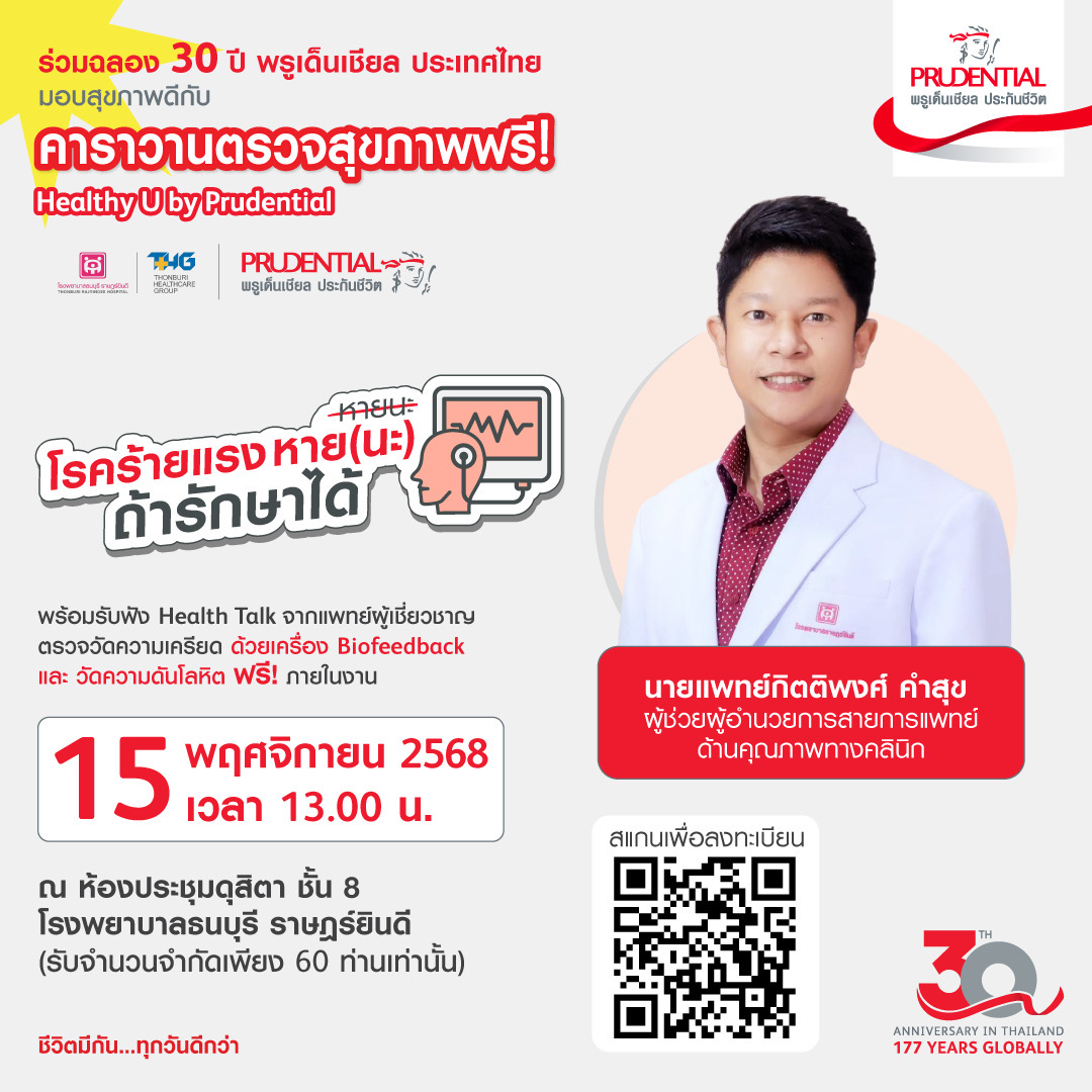 บริษัท พรูเด็นเชียล ประกันชีวิต (ประเทศไทย) จำกัด (มหาชน) หรือ พรูเด็นเชียล ประเทศไทย เดินหน้าสานต่อกลยุทธ์ด้านสุขภาพ “Peace-of-mind Plan” ในการสร้างความอุ่นใจให้กับลูกค้า เพราะ เชื่อว่า "สุขภาพ" ไม่ใช่แค่การรักษา แต่คือการดูแลแบบองค์รวม ตั้งแต่การป้องกัน การส่งเสริมสุขภาพ ไปจนถึงการเข้าถึงบริการที่เหมาะสม ในโอกาสฉลองครบรอบ 30 ปี ของการดำเนินธุรกิจในประเทศไทย พรูเด็นเชียลฯ จึงได้จัดกิจกรรมพิเศษ “Healthy U by Prudential” คาราวานตรวจสุขภาพที่ร่วมมือกับโรงพยาบาลพันธมิตรชั้นนำ ให้คุณได้รับบริการตรวจสุขภาพเบื้องต้นฟรี ไม่มีค่าใช้จ่าย พร้อมรับความรู้ด้านสุขภาพจากแพทย์ผู้เชี่ยวชาญ ในวันศุกร์ที่ 15 พฤศจิกายน 2568 เวลา 13.00 น. ณ ห้องประชุมดุสิตา ชั้น 8 โรงพยาบาลธนบุรี ราษฎร์ยินดี
