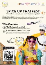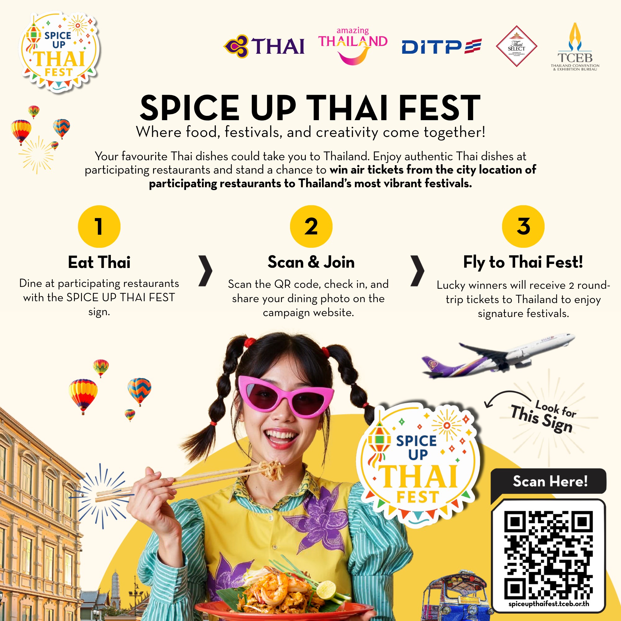 สำหรับแคมเปญ Spice Up Thai Fest ลูกค้าเพียงรับประทานอาหารที่ร้านอาหารไทยในต่างประเทศที่เข้าร่วมโครงการ พร้อมสแกน QR Code ณ ร้านอาหารที่เข้าร่วม เพื่อเข้าสู่แพลตฟอร์มออนไลน์ www.SpiceUpThaiFest.tceb.or.th และร่วมกิจกรรมโดยถ่ายภาพพร้อมบรรยายความรู้สึกกับอาหารไทยและอัตลักษณ์ความเป็นไทย และเช็คอินบนแพลตฟอร์ม ก็มีโอกาสได้รับตั๋วเครื่องบินไป-กลับจากสายการบินไทย รวมกว่า 55 รางวัล เพื่อมาร่วมสัมผัสประสบการณ์งานเฟสติวัลไทยในประเทศไทย โดยสามารถร่วมกิจกรรมได้ตั้งแต่วันที่ 15 พฤศจิกายน 2568 – 18 มกราคม 2569 พร้อมประกาศผู้ได้รับรางวัลบนแพลตฟอร์มในวันที่ 22 มกราคม 2569 สามารถติดตามรายละเอียดแคมเปญได้ที่ www.SpiceUpThaiFest.tceb.or.th