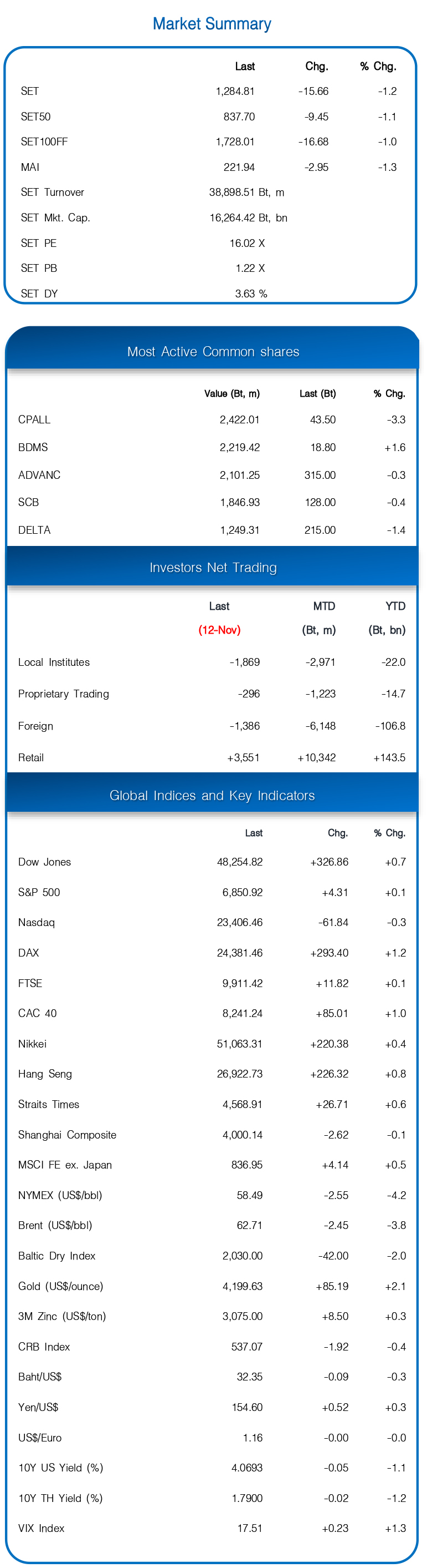 1300 ไม่อยู่แล้ว – SET แกว่งอิงแดนลบในกรอบ 1284-1303 อ่อนแอกว่าตลาดหุ้นตปท. ไม่ขานรับความหวังการยุติปัญหาชัตดาวน์ของสหรัฐฯ โดยมีแรงขายหุ้นค้าปลีกผิดหวังงบ CPAXT กระทบต่อหุ้น CPALL ด้วย และหุ้นขนาดใหญ่อื่น ๆ จากต่างชาติขายสุทธิหนัก 1.38 พันลบ. 5 วันติด และพลิก Short S50 Futures 19,497 สัญญา