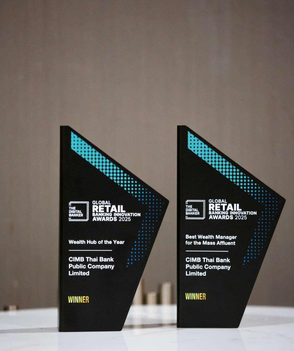 ธนาคารซีไอเอ็มบี ไทย จำกัด (มหาชน) ประกาศความสำเร็จครั้งสำคัญบนเวทีระดับโลก ด้วยการคว้า 2 รางวัลอันทรงเกียรติจาก Global Retail Banking Innovation Awards 2025 ได้แก่ Best Wealth Manager for the Mass Affluent และ Wealth Hub of the Year ซึ่งสะท้อนถึงความมุ่งมั่นของธนาคารในการยกระดับบริการบริหารความมั่งคั่งแบบครบวงจร ด้วยนวัตกรรมดิจิทัลที่เข้าถึงง่าย ปลอดภัย และตอบโจทย์ทุกความต้องการของลูกค้า โดยมี คุณภูดินันท์ เศรษฐนันท์ Head, Affluent & Wealth Management (ซ้าย) และคุณธนภูมิ สกุลพฤกษาชาติ (ขวา) Head, Investment Products เป็นตัวแทนรับรางวัล