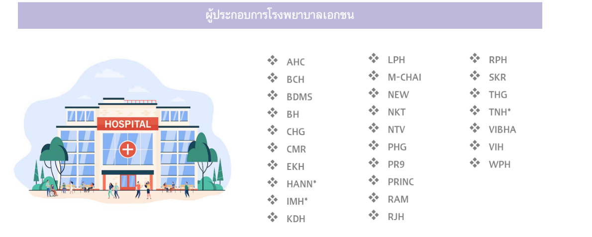 ธุรกิจโรงพยาบาลเอกชน คือธุรกิจที่ให้บริการทางการแพทย์ภายใต้การบริหารของภาคเอกชน โดยโรงพยาบาลเอกชนในไทย ณ เดือนมิถุนายนปี 2025 มีจำนวนทั้งสิ้น 456 แห่ง คิดเป็นราว 30% ของจำนวนโรงพยาบาลทั่วประเทศ มีเตียงผู้ป่วยรวมกันทั้งสิ้น 4.2 หมื่นเตียง และกว่า 153 แห่งอยู่ในกรุงเทพฯ ทั้งนี้โรงพยาบาลเอกชนสามารถแบ่งประเภทได้หลายรูปแบบตามเกณฑ์ที่กำหนด เช่น จำนวนเตียง (ขนาดเล็ก, ขนาดกลาง และขนาดใหญ่), ลักษณะการให้บริการ (โรคทั่วไป และเฉพาะทาง), ความซับซ้อนทางการแพทย์ (ปฐมภูมิ, ทุติยภูมิ และตติยภูมิ) และกลุ่มผู้ป่วยเป้าหมาย (ชาวไทย และชาวต่างชาติ) สำหรับผู้ประกอบการโรงพยาบาลเอกชนที่จดทะเบียนในตลาดหลักทรัพย์แห่งประเทศไทย มีทั้งสิ้น 27 ราย ครอบคลุมโรงพยาบาลกว่า 180 แห่ง และให้บริการทางการแพทย์อย่างครบวงจรในหลากหลายสาขา ประกอบด้วย AHC, BCH, BDMS, BH, CHG, CMR, EKH, HANN, IMH, KDH, LPH, M-CHAI, NEW, NKT, NTV, PHG, PR9, PRINC, RAM, RJH, RPH, SKR ,THG, TNH, VIBHA, VIH และ WPH