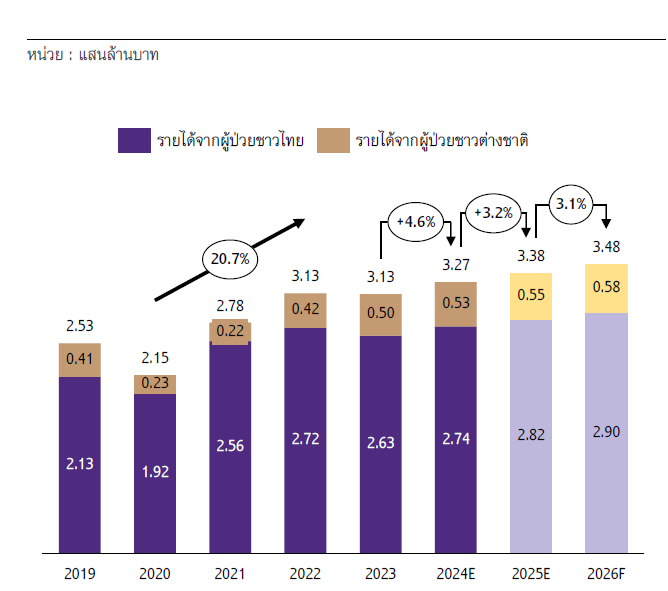 ในปี 2026 รายได้ธุรกิจโรงพยาบาลมีแนวโน้มขยายตัวลดลงเล็กน้อยที่ 3.1%YoY และมีมูลค่า 3.5 แสนล้านบาท จากกลุ่มผู้ป่วยชาวไทยที่ได้รับแรงกดดันจากเศรษฐกิจไทยที่ยังขยายตัวต่ำ ส่วนกลุ่มผู้ป่วยชาวต่างชาติยังมีแนวโน้มขยายตัวต่อเนื่องจากเศรษฐกิจโลกที่เติบโตใกล้เคียงเดิม ประกอบกับนักท่องเที่ยวเชิงการแพทย์ในหลายประเทศที่หดตัวในปี 2025 มีโอกาสกลับเข้ามารับการรักษาเพิ่มขึ้นอย่างเช่น กัมพูชา, คูเวต และจีน หากปัญหาในแต่ละกรณีคลี่คลายลง ซึ่งได้แก่ ความขัดแย้งระหว่างไทย-กัมพูชา การปรับนโยบายการส่งผู้ป่วยของรัฐบาลคูเวต และความกังวลด้านความปลอดภัยในไทยของชาวจีน นอกจากนี้ รายได้ธุรกิจโรงพยาบาลเอกชนจะได้รับแรงสนับสนุนจากการเข้าสู่สังคมผู้สูงอายุโดยสมบูรณ์ (Aged society) ทั่วโลกรวมถึงไทย ประกอบกับแนวโน้มการเกิดโรคไม่ติดต่อเรื้อรังที่สูงขึ้นทั่วโลก และไทยยังคงเป็นประเทศยอดนิยมสำหรับกลุ่ม Medical tourist ทั่วโลก จากคุณภาพการรักษาพยาบาลที่ได้มาตรฐานสากลและค่ารักษาพยาบาลที่แข่งขันได้
