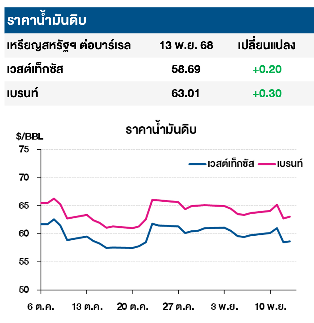 (+) ราคาน้ำมันดิบเวสต์เท็กซัสและเบรนท์ปรับเพิ่มเล็กน้อย หลังหน่วยงานรัฐบาลสหรัฐฯ มีกำหนดกลับมาเปิดดำเนินการอีกครั้ง เมื่อวันพฤหัสบดีที่ผ่านมา ซึ่งคาดว่าจะช่วยกระตุ้นอุปสงค์น้ำมันได้ในระยะสั้น ขณะเดียวกันนักลงทุนกังวลเกี่ยวกับผลกระทบด้านอุปทาน จากมาตรการคว่ำบาตรของสหรัฐฯ ต่อบริษัท Lukoil ซึ่งเป็นบริษัทน้ำมันรายใหญ่ของรัสเซีย โดยมาตรการคว่ำบาตรนี้เป็นส่วนหนึ่งของความพยายามกดดันให้รัสเซียเข้าร่วมการเจรจาสันติภาพ เพื่อยุติสงครามในยูเครน ทั้งนี้ อาจส่งผลให้บริษัทต่างๆ ไม่สามารถทำธุรกรรมกับบริษัท Lukoil ได้หลังจากวันที่ 21 พ.ย. 68