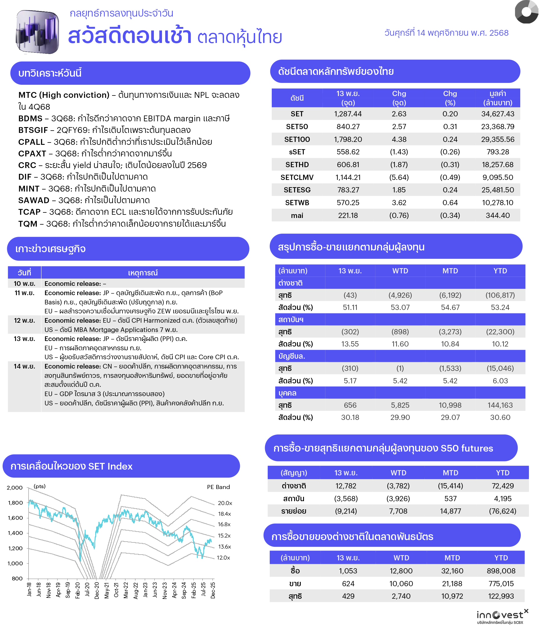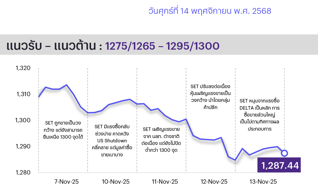 คาดตลาดแกว่งไซด์เวย์/พักตัว ปัจจัยในประเทศ จับตาการประกาศงบฯ 3Q68 วันสุดท้ายอาจมีความผันผวนจาก Sell on Fact ขณะที่ปัจจัยต่างประเทศมีแรงกดดันจากความไม่แน่นอนเฟดปรับลดดอกเบี้ยในเดือน ธ.ค. ส่วนจีนวันนี้มีรายงานข้อมูลศก. เช่น ยอดค้าปลีก การผลิตภาคอุตสาหกรรม ซึ่งอาจมีผลต่อตลาดเอเชียเช้านี้ ทางเทคนิคหากดัชนีไม่ยืนเหนือ 1285 จะเป็นสัญญาณลบ มีโอกาสลงมาแนวรับถัดไปที่ 1275/1265 ส่วนแนวต้านที่ 1295/1300