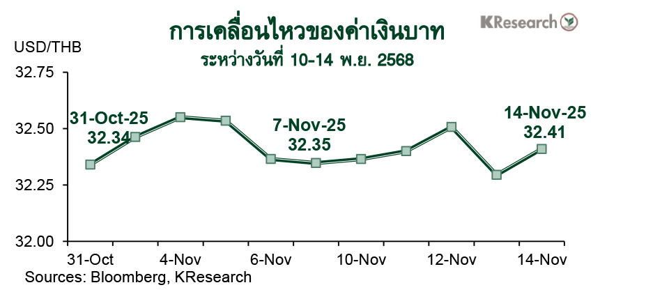 อย่างไรก็ดี เงินบาทพลิกแข็งค่าในระหว่างสัปดาห์ เนื่องจากตลาดคาดการณ์ว่า ตัวเลขเศรษฐกิจสหรัฐฯ ที่จะกลับมาประกาศหลังชัตดาวน์ อาจออกมาอ่อนแอ แต่กรอบการแข็งค่าของเงินบาทก็เป็นไปอย่างจำกัด และเงินบาทกลับไปอ่อนค่าลงอีกครั้งช่วงท้ายสัปดาห์ท่ามกลางแรงหนุนของเงินดอลลาร์ฯ เนื่องจากเจ้าหน้าที่เฟดหลายท่านยังคงส่งสัญญาณกังวลต่อสถานการณ์เงินเฟ้อของสหรัฐฯ ซึ่งทำให้จังหวะการลดดอกเบี้ยในเดือนธ.ค. ยังมีความไม่แน่นอน